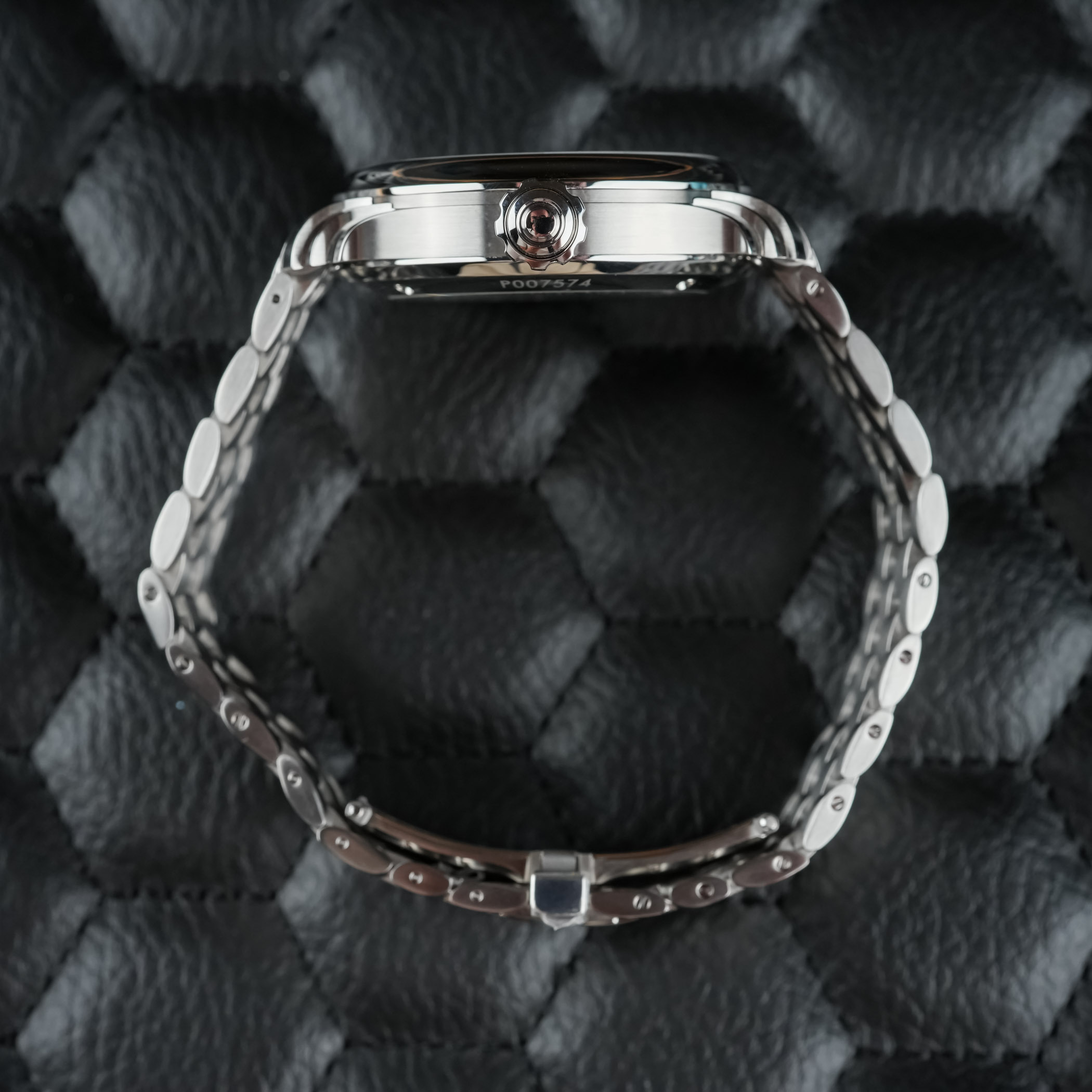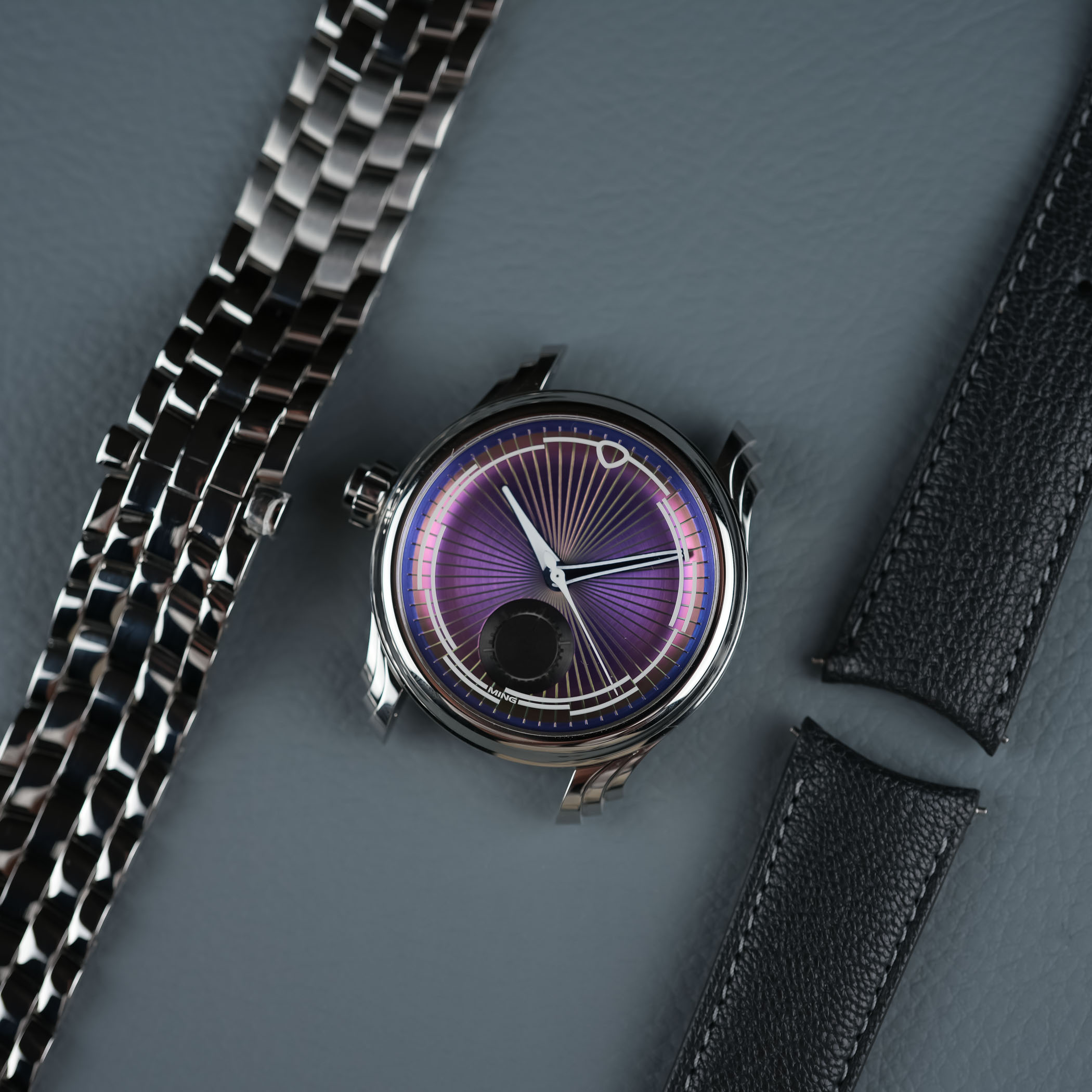The 57.04 Iris ships with two options: Ming´s stainless steel Universal Bracelet, designed to integrate across multiple models, and an anthracite goat leather strap fitted with a stainless steel tuck buckle. The 20mm lug width allows for broad strap compatibility, though the sculptural stepped lugs give the watch a strong visual identity regardless of choice.