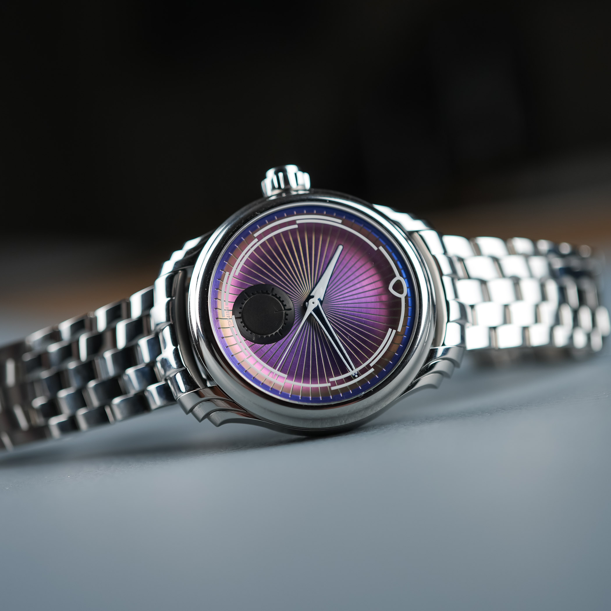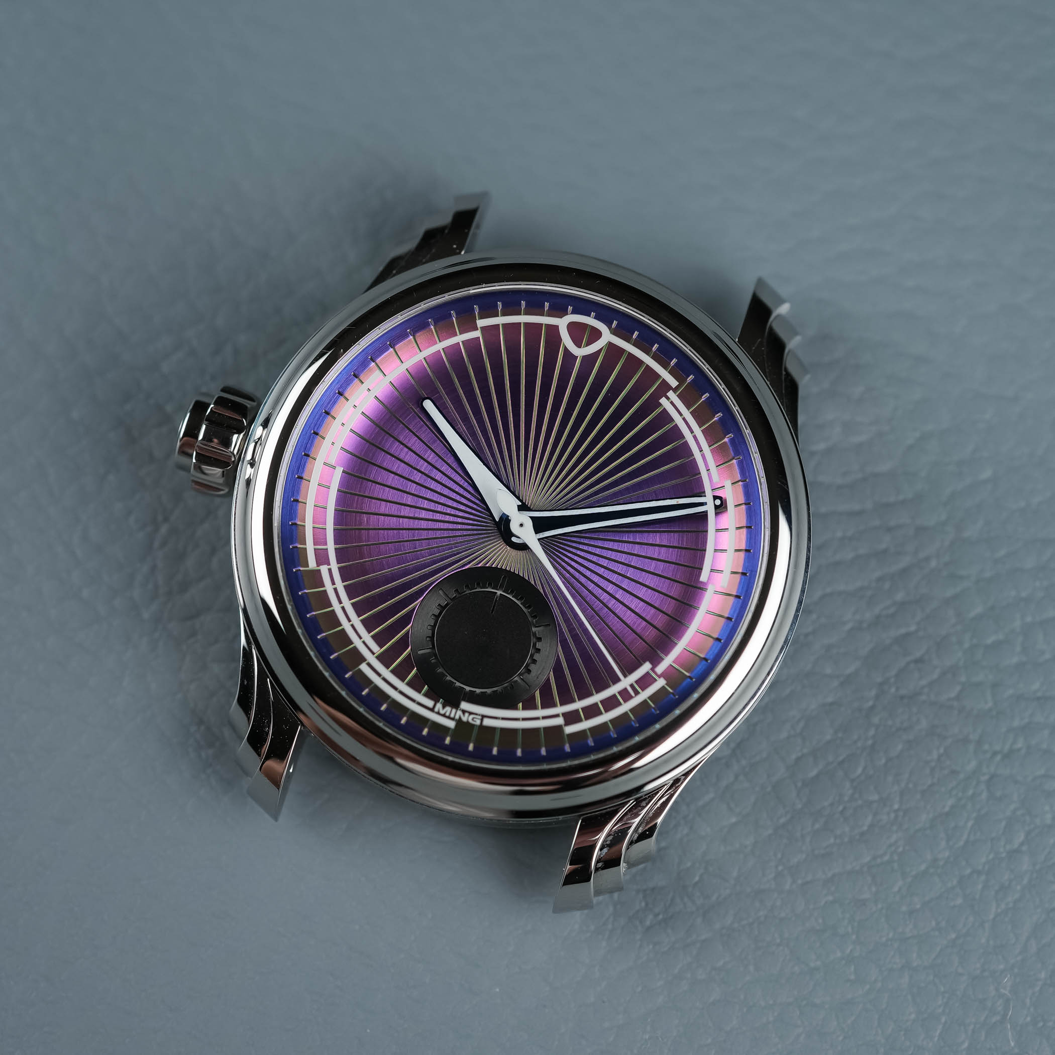 The Ming 57.04 Iris earns its name from the dial. The “Iris effect” is created with a multiphasic coating over a brass base, producing colour shifts that can look turquoise, purple, green, or orange depending on light and angle. It’s dynamic, hard to pin down, and alive in a way few dials manage. The deep, fluted dial layout adds dimensionality, while a sandwich-style 30-minute chronograph counter at 6 o’clock exudes a black hole-like pull in daylight but shines like a star in the dark thanks to luminous treatment.
