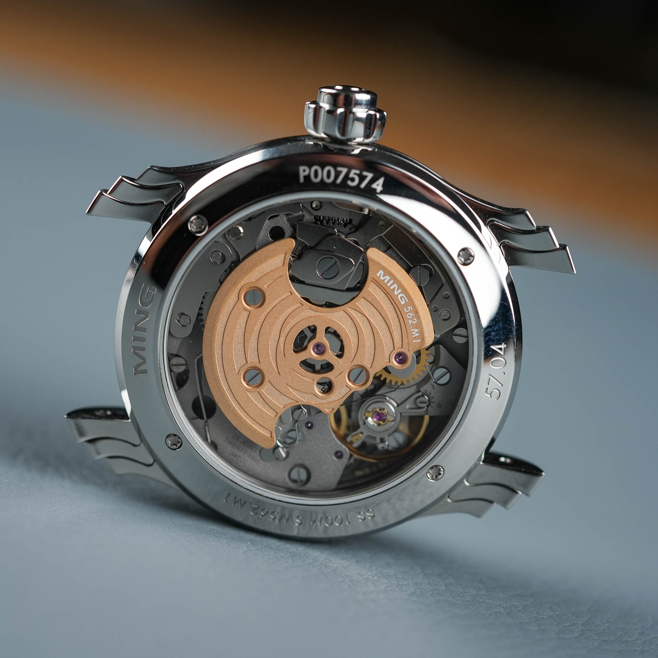 The diamond-cut, blue-coated hands are also filled with Super-LumiNova X1, keeping the design performance-oriented even while it plays with light and colour. The look of the watch at night is, as often with Ming, as powerful as it is during daylight.