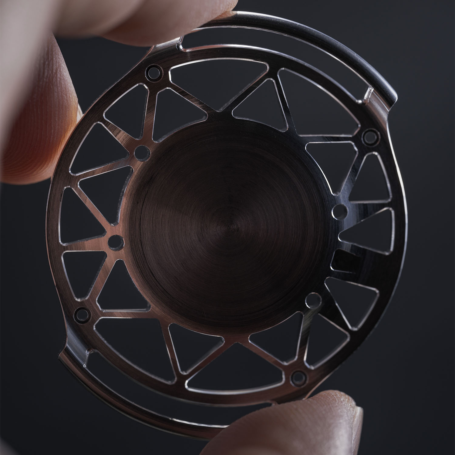 One of the first tasks was to rethink the case construction to reduce the amount of metal required while retaining rigidity. Instead of ultra-light carbon fibre or hollow-core 3D printing, Ming discovered that the AZ31 Magnesium-Aluminium-Zinc-Manganese alloy was lighter than carbon and more consistent than hollow 3D printing; more importantly, it transmitted the feel of metal. The AZ31 alloy was further treated with plasma-electrolytic oxidation (PEO) to enhance corrosion resistance and biocompatibility.