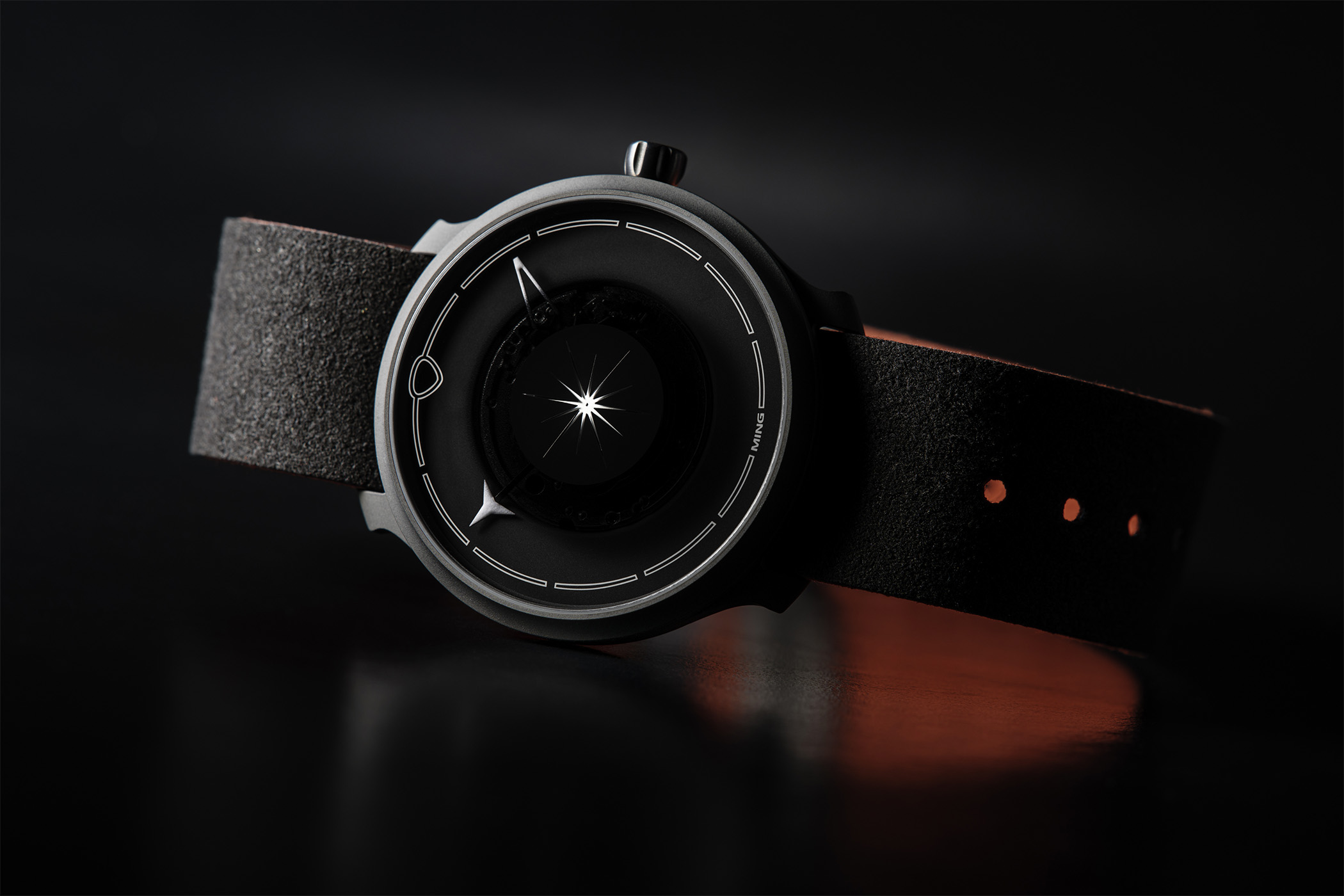 There is no dial per se: the outer ring is the movement holder, and the central area containing the movement is hidden by a dark gradient printed on the outer crystal. The signature skeletonised dashes marking the hours and minutes are also printed on the crystal, and there is a star-shaped running indicator (pulse seconds) in the centre. To read the time, the LW.01 models use a shuriken hour hand borrowed from Ming’s 17.03 and an openworked triangle for the minutes.