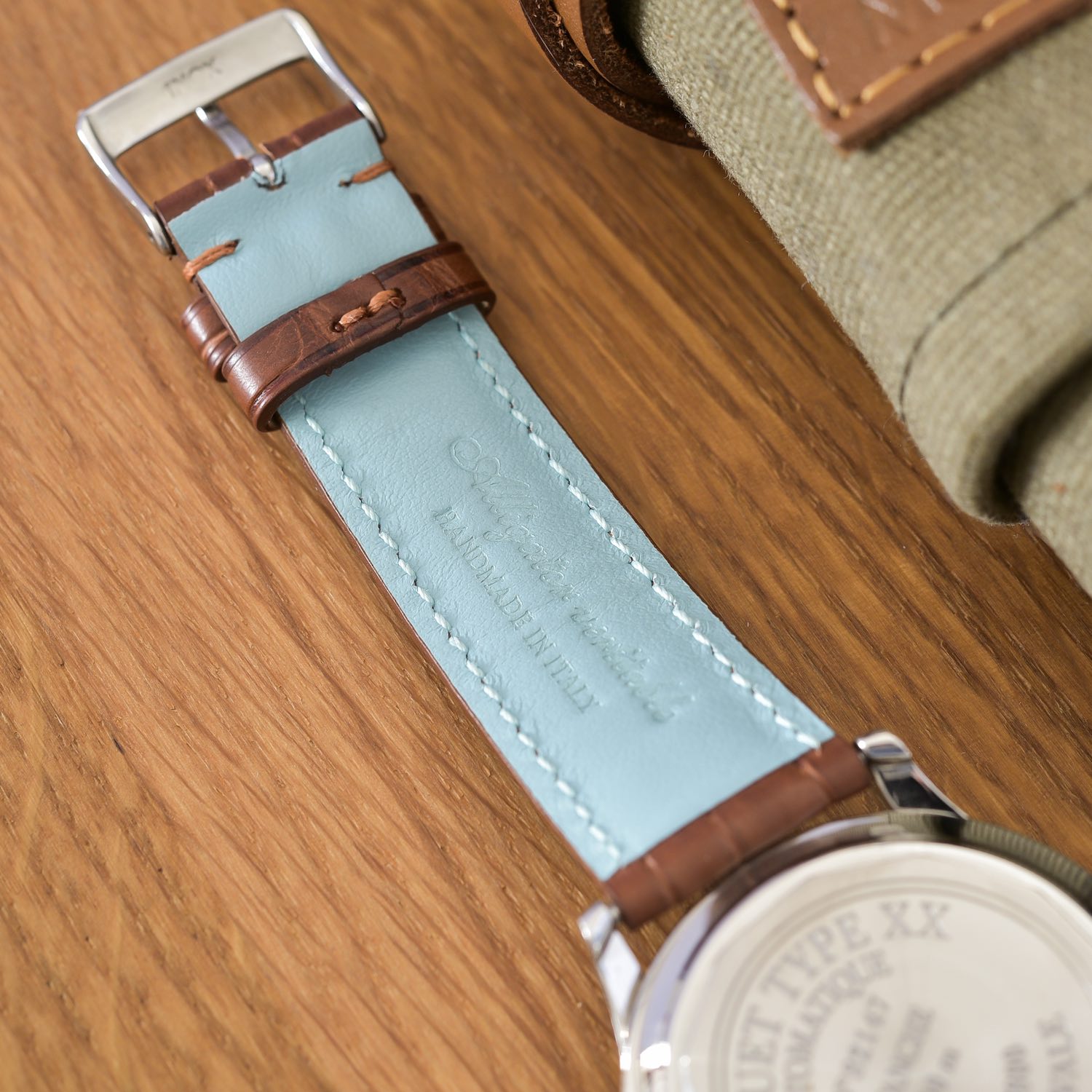 MONOCHROME’s alligator straps are made by hand by a family workshop in Northern Italy and crafted from the most supple alligator leather we have ever had on our wrist. And believe us – we’ve tried a few. And we’ve added our personal (discreet) touch to them, with a light blue leather lining.
