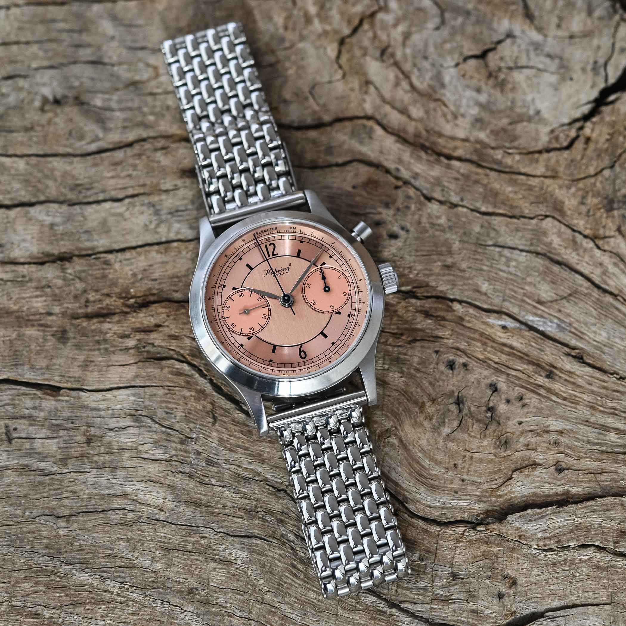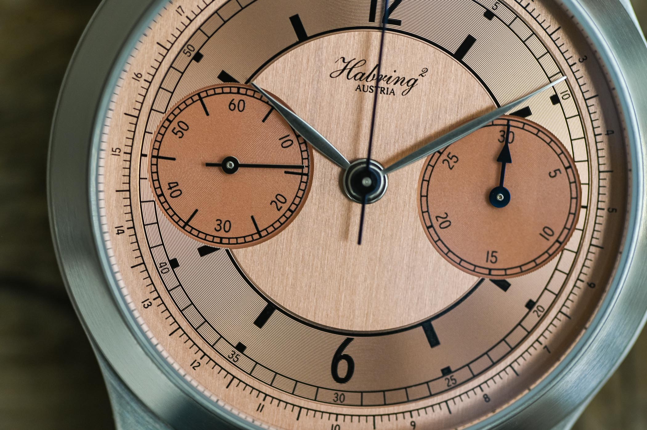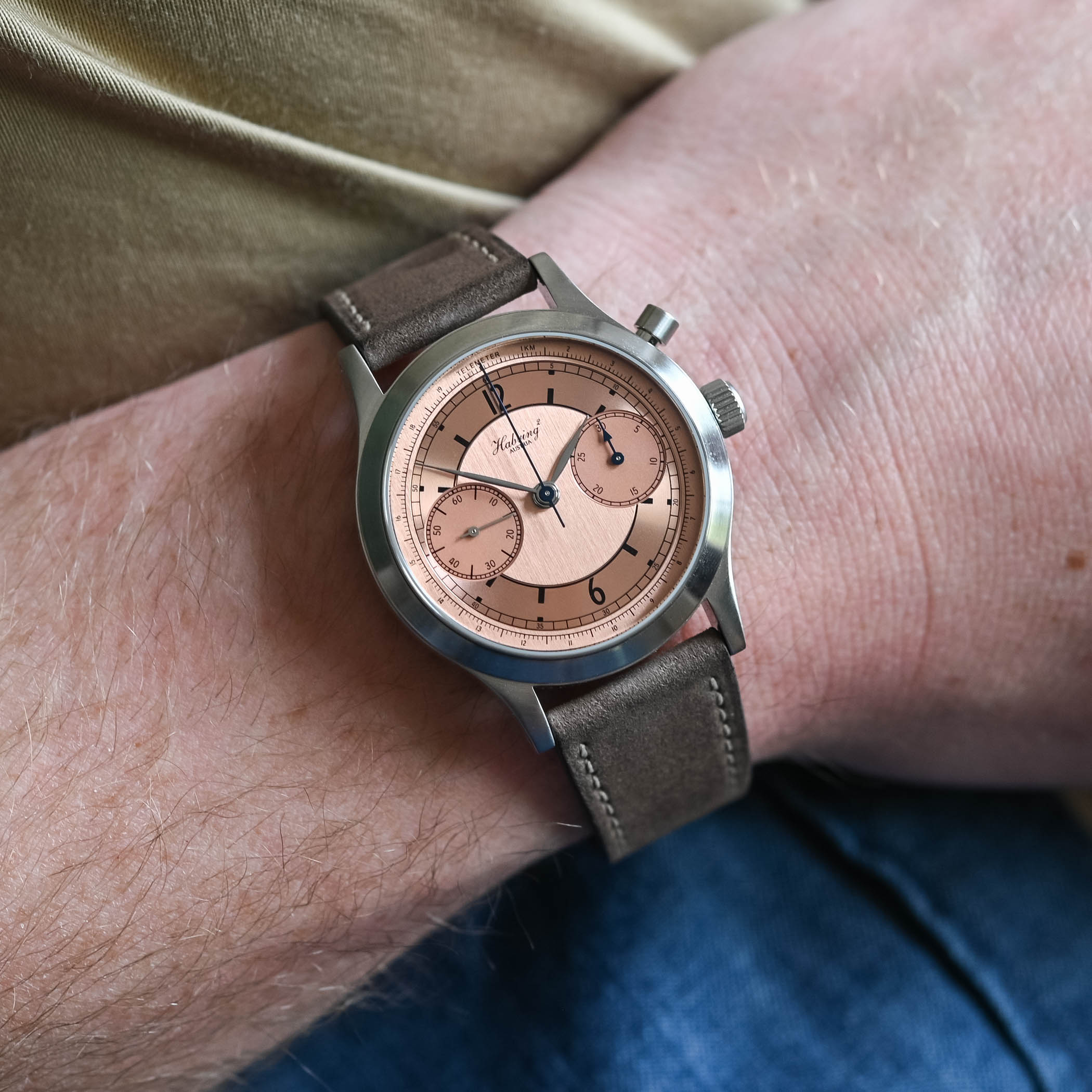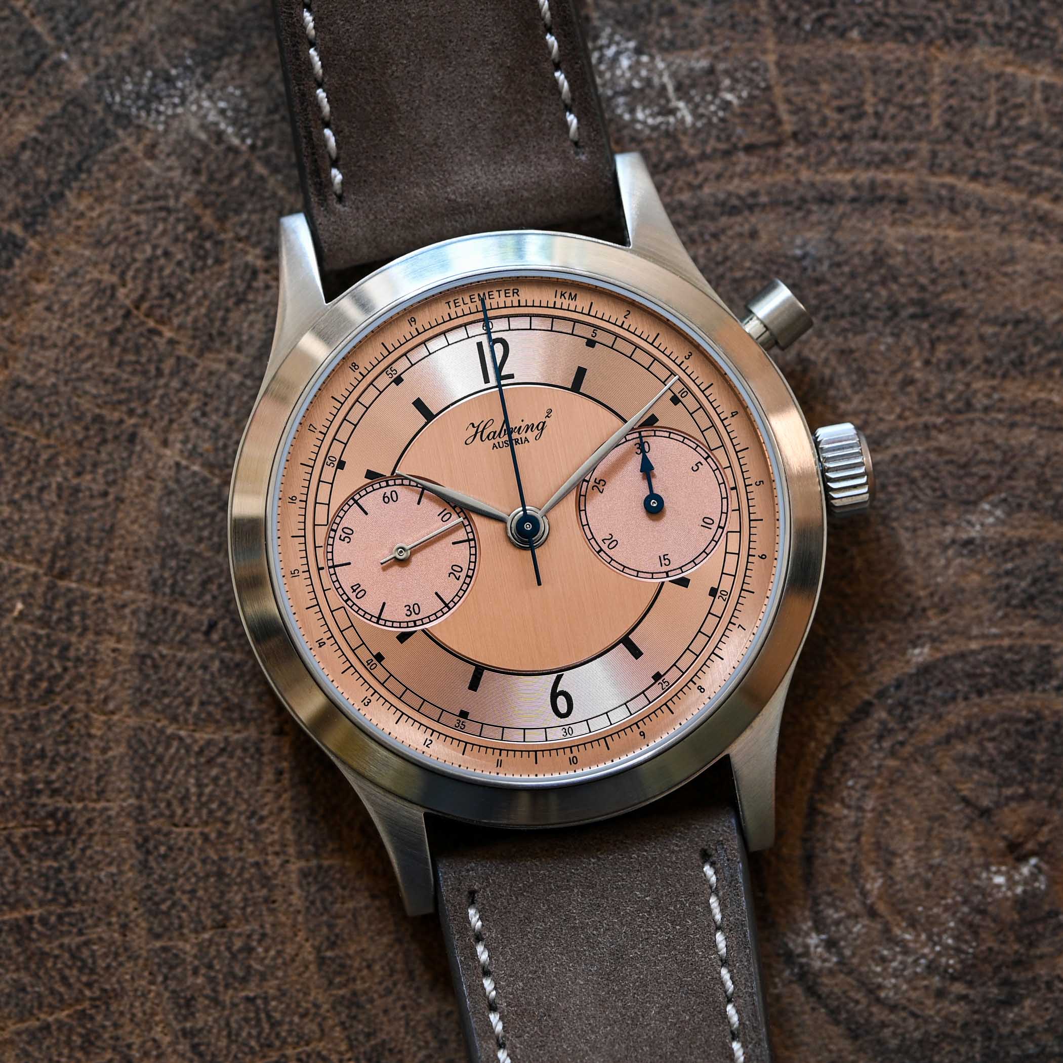 Our first collaboration watch, offered via a subscription campaign, is a salmon sector dial monopusher made with Habring².