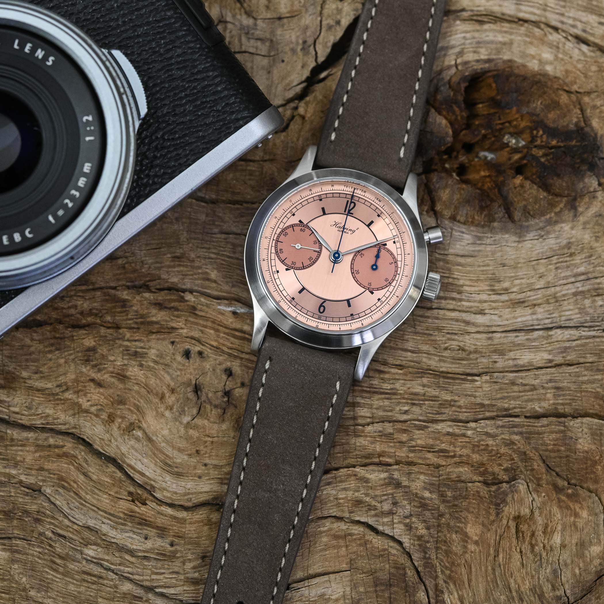 The base for the MONOCHROME Montre de Souscription 1 is the compact and elegant Habring² Chrono-Felix watch, a cornerstone model in Maria and Richard’s collection equipped with a technically advanced monopusher chronograph movement developed and assembled internally by Habring². One of our goals was to give the watch a distinctive vintage twist. The dial, which recalls the dials of some of the most attractive chronographs produced in the 1940s, features a sector layout, precision railroad tracks and a telemeter scale. As an all-time favourite of the MONOCHROME team, the two-tone salmon colour dial was unanimously approved.