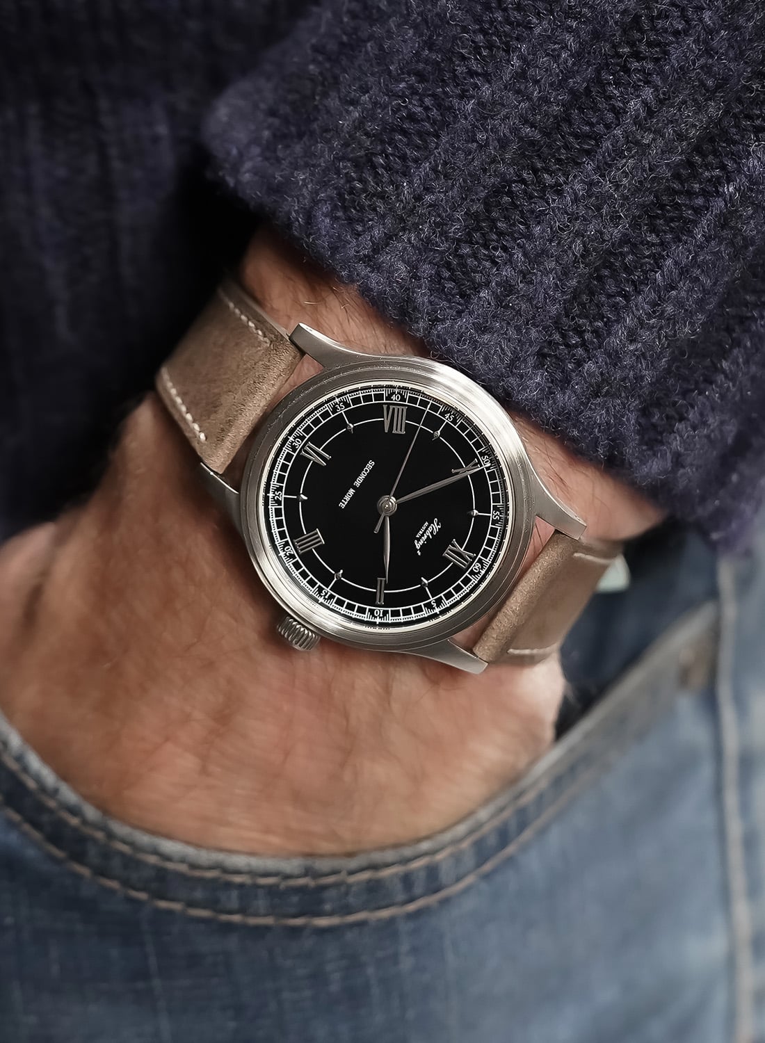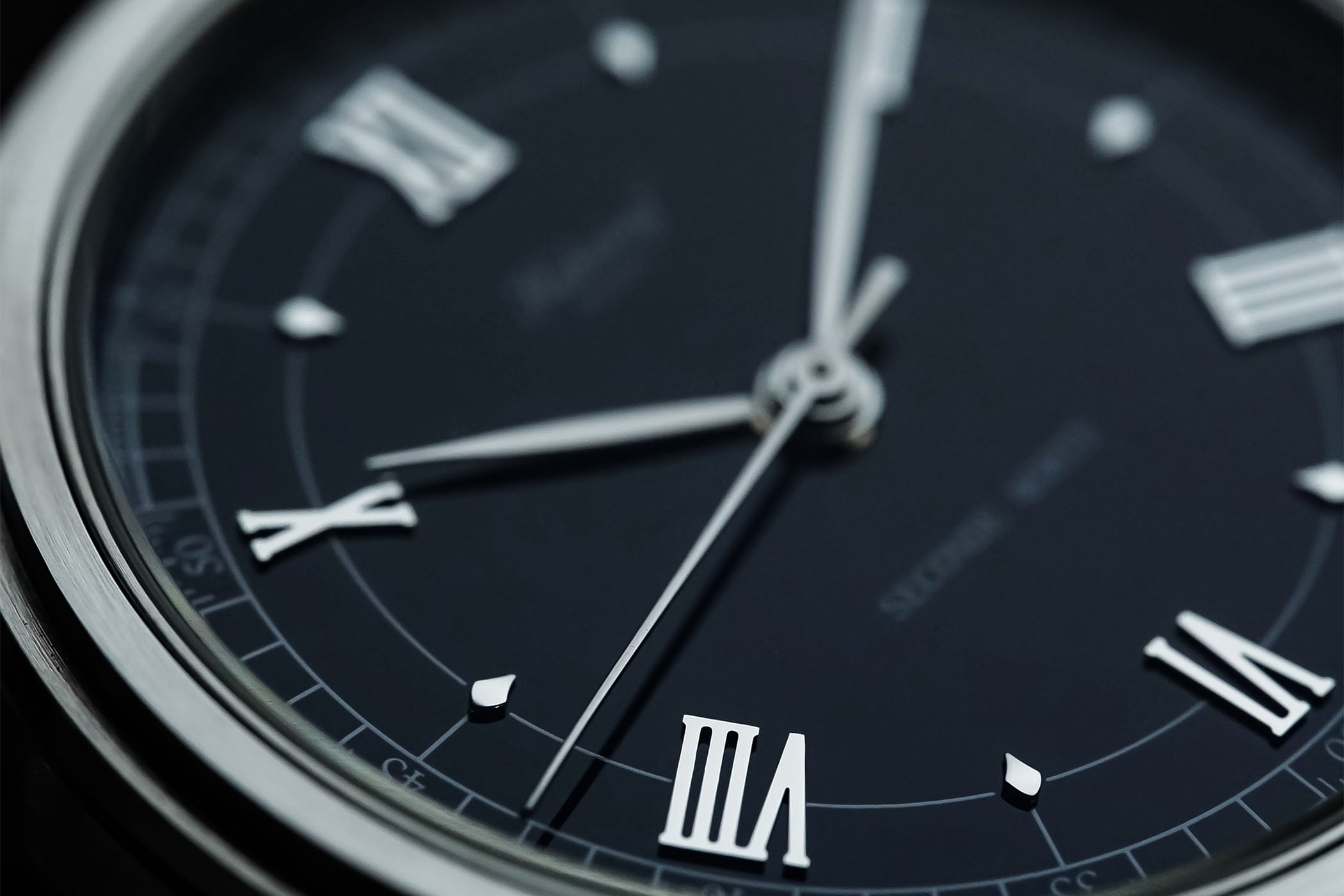 Art Deco inspiration is clear here, particularly in the highly detailed seconds track, the unique shape of the Roman numerals and the applied diamond-shaped hour markers. Deliberately slim and elongated, these polished elements are paired with a glossy black dial and thin white-printed tracks, numerals, and logos. There is an undeniable tension in this dial, a contrast between the utilitarian feel of the brushed case and this elegant, detailed dial that wouldn’t be out of place in a 1930s dress watch. To remain consistent with the Montre de Souscription series, we’ve opted for a French “Seconde Morte” indication at 6 o’clock.