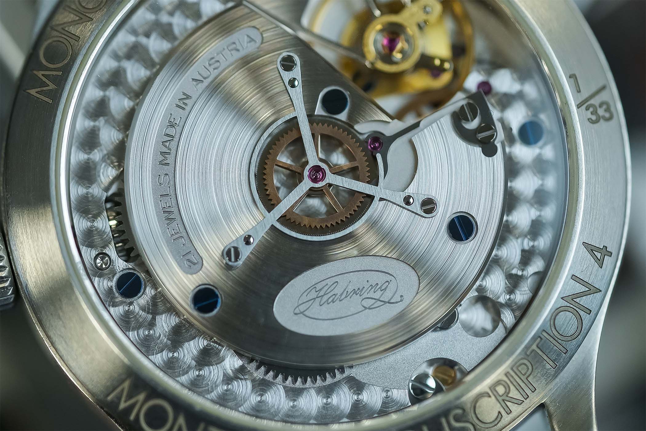 This deadbeat or Seconde Morte mechanism is neatly integrated into the A11 base movement, adding only 2mm to the watch’s total thickness – compared to a classic Felix model. The hand-wound A11S calibre is manufactured in-house by Habring² in Austria, with most parts produced in-house or custom-made by independent suppliers according to Habring² specifications, in Austria, Germany or Switzerland. Running at a 4Hz frequency, it is equipped with a tangential screw fine adjustment, an anti-magnetic escapement with a Carl Haas chronometer-quality balance spring, and a KIF shock protection in compliance with DIN and NIHS standards. Its single barrel delivers a comfortable 48-hour power reserve. The sapphire back of the MONOCHROME Montre de Souscription 4 Seconde Morte reveals an elegant hand-decorated finish, including polished edges, decorative engravings, brushed surfaces, perlage, and heat-blued screws.