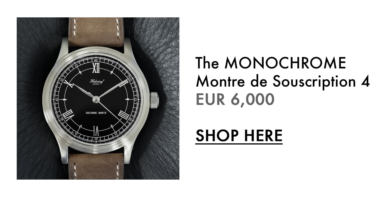 Available at the MONOCHROME Shop, the Montre de Souscription 4 Seconde Morte watch is priced at EUR 6,000 excluding taxes, and includes free insured international shipping and a 3-year warranty by Habring². When ordering the watch, we will ask for a non-refundable deposit of EUR 2,000 (excl. taxes). The remaining amount will be charged when the watch is ready to be shipped.