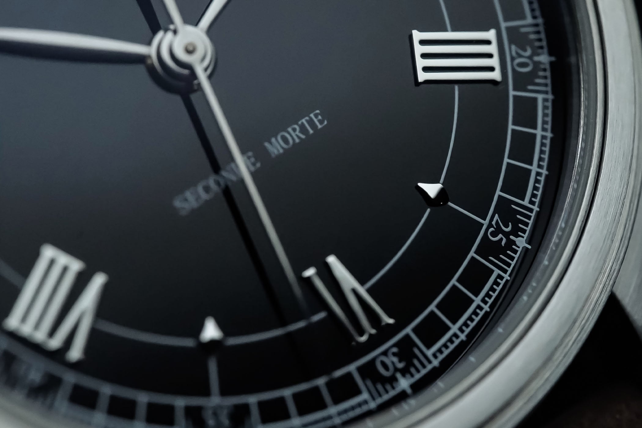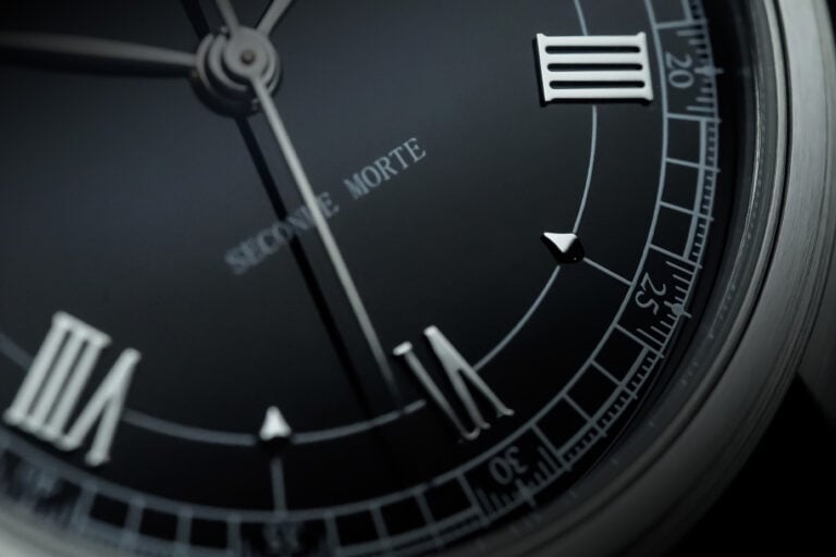 Art Deco inspiration is clear here, particularly in the highly detailed seconds track, the unique shape of the Roman numerals and the applied diamond-shaped hour markers. Deliberately slim and elongated, these polished elements are paired with a glossy black dial and thin white-printed tracks, numerals, and logos. There is an undeniable tension in this dial, a contrast between the utilitarian feel of the brushed case and this elegant, detailed dial that wouldn’t be out of place in a 1930s dress watch. To remain consistent with the Montre de Souscription series, we’ve opted for a French “Seconde Morte” indication at 6 o’clock.