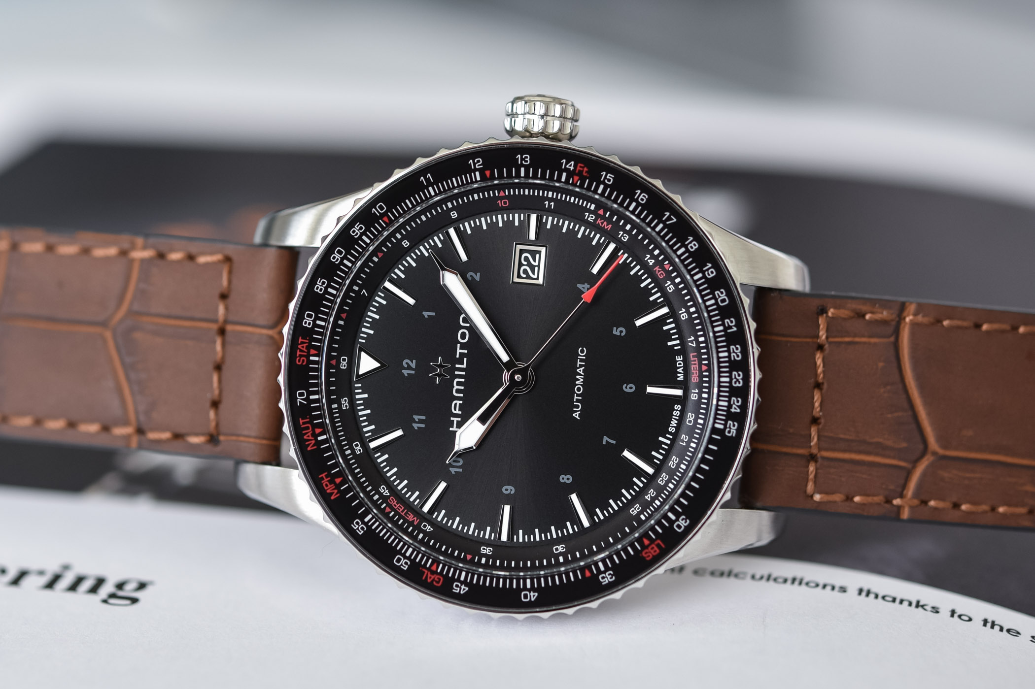 Quick facts: 42mm diameter – stainless steel case – sapphire crystal and slide rule bezel with K1 mineral glass insert – 100m water-resistant – calibre Hamilton H-10, automatic – leather strap or steel bracelet – from EUR 1,095 – www.hamiltonwatch.com