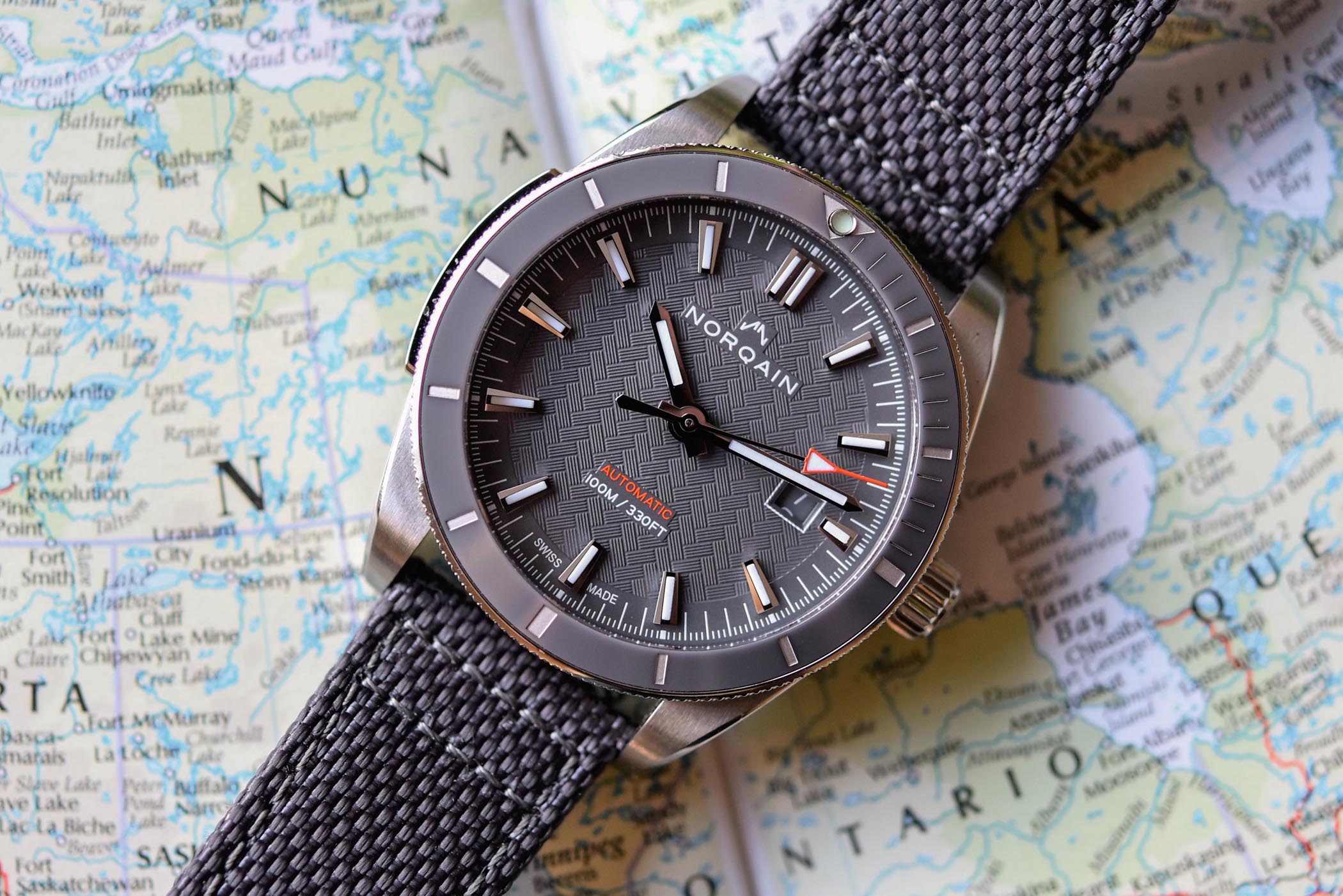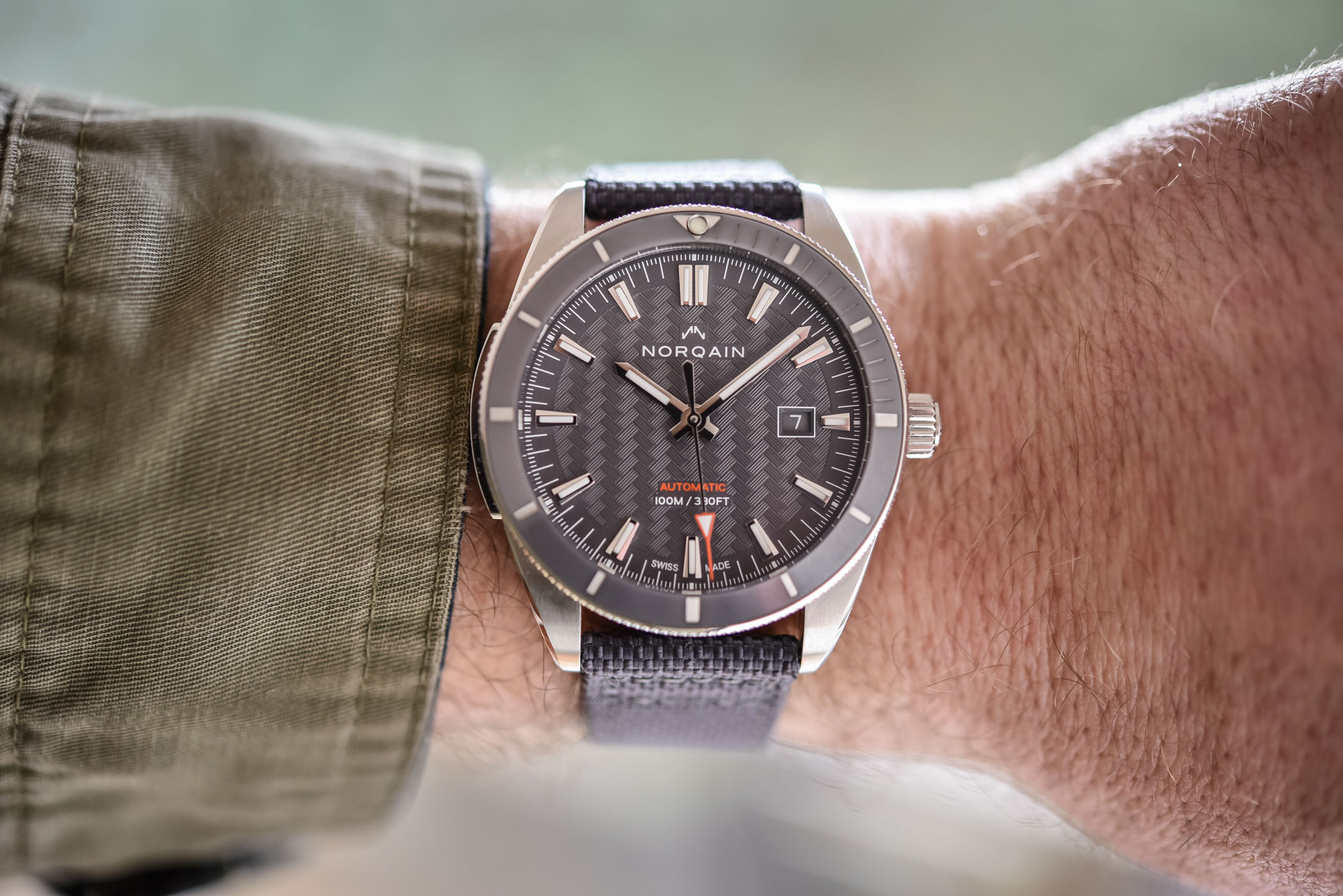 Quick facts: 42mm diameter – stainless steel case – sapphire crystal – ceramic bezel – 100m water-resistant – ETA 2824, automatic – Cordura fabric strap, also available on steel bracelet – EUR 1,740 – www.norqain.com