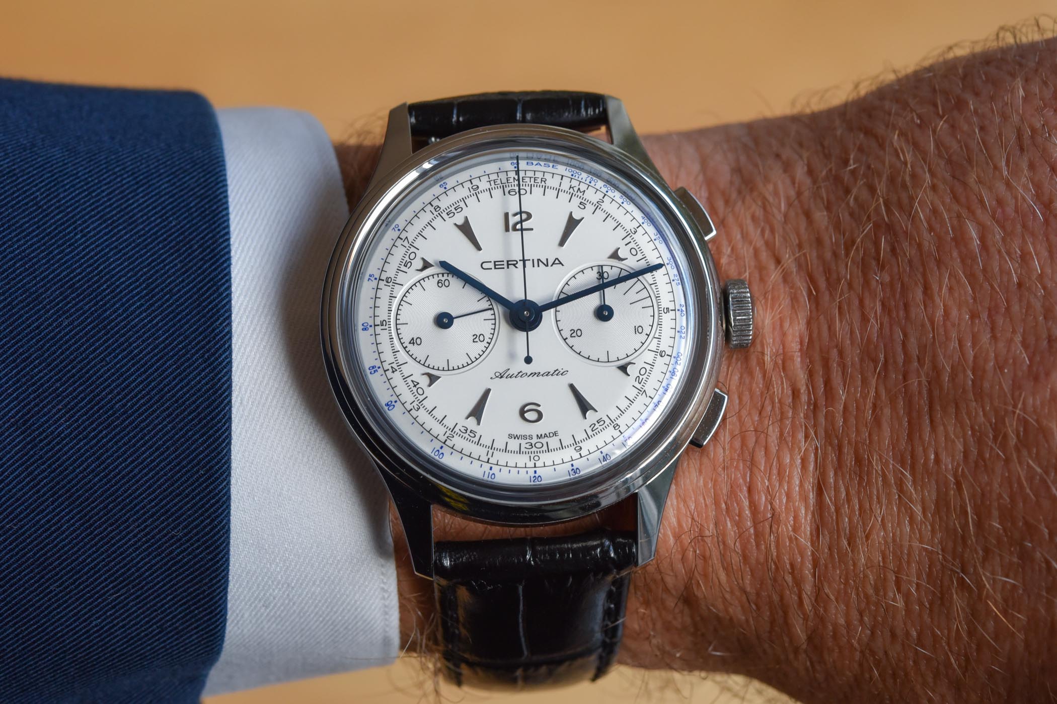 Quick facts: 42mm diameter – stainless steel case – domed sapphire crystal – 100m water-resistant – calibre A05.H31, base ETA 7753, automatic cam-lever chronograph – leather strap with quick-release system – EUR 1,920 – certina.com