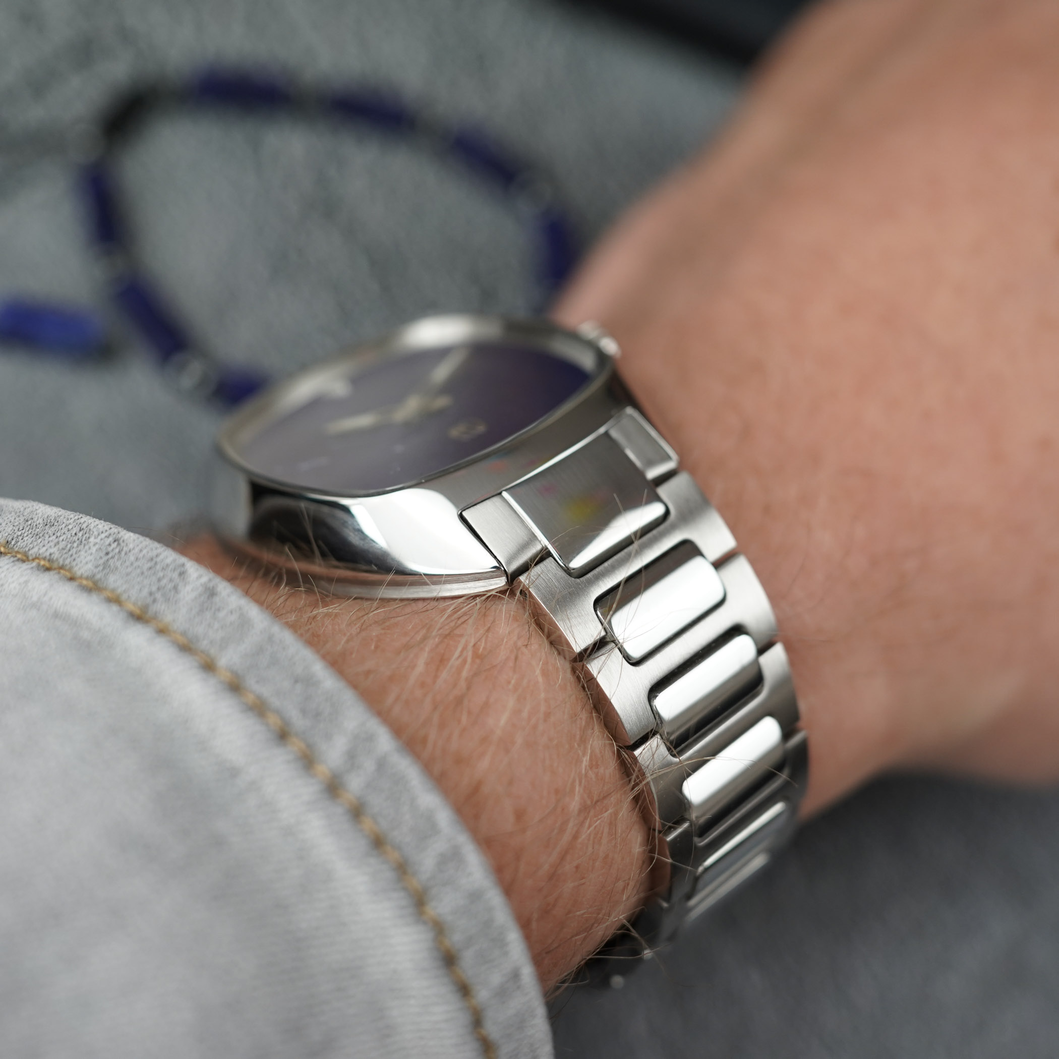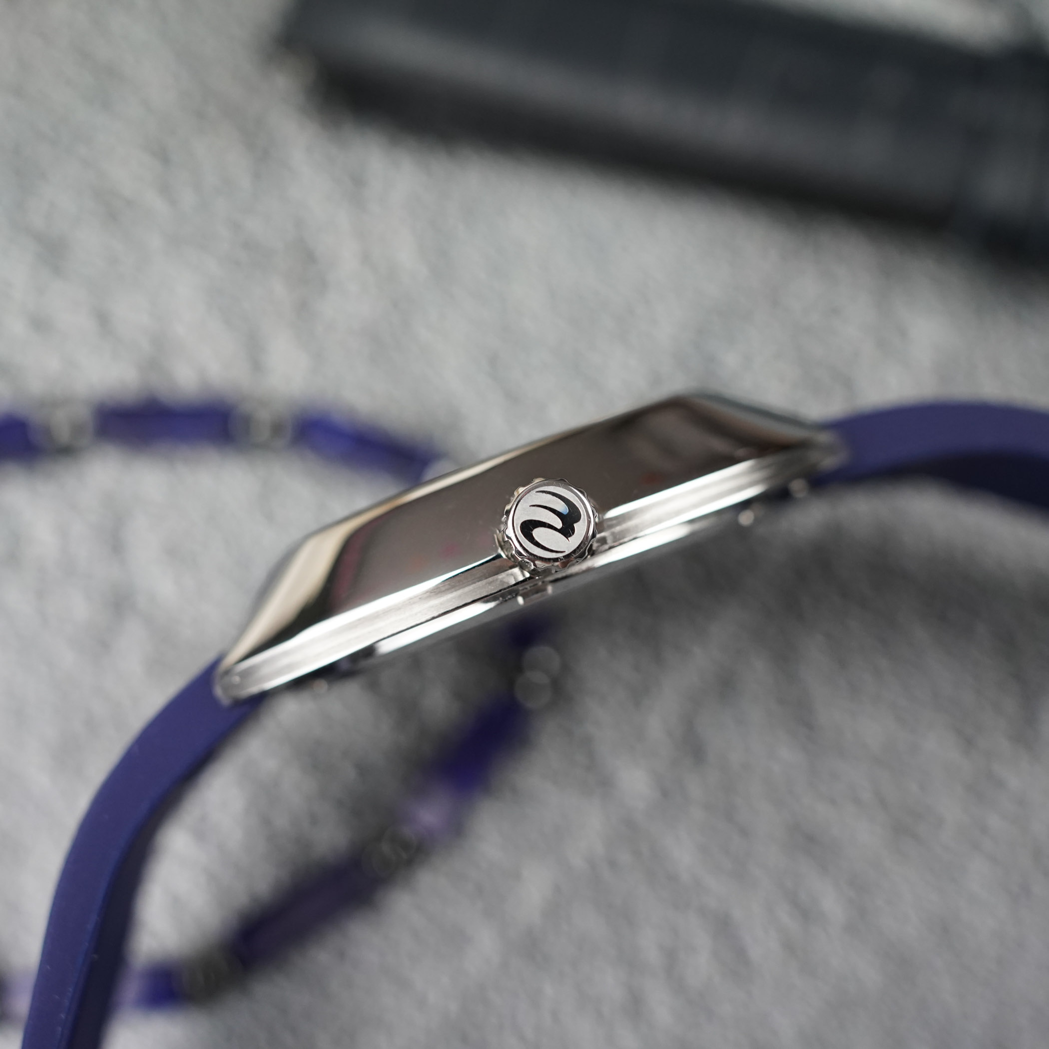 The stainless steel case is mostly polished with a tonneau(ish) shape and long, flowing curvature to the solid and flat case back. The latter is nicely embossed and numbered, and coupled with the screw-down signed crown, water resistance is 50 metres. Not spectacular, but rain and light swimming should be fine. A sapphire crystal protects the dial with an anti-reflective inner coating. It’s a fresh and somewhat daring aesthetic that certainly breaks away from the norm without going overboard. At 40mm in diameter and only 9.7mm in height (lug-to-lug 47mm), it’s also very wearable for everyday use. To help keep the polished sides clean, there’s an unusual anti-fingerprint coating that’s nice to see. A stainless steel bracelet with polished centre links and a butterfly clasp merge well with the case, and a purple rubber or black leather strap is also offered. As a bonus, a dial-matching lapis lazuli bracelet comes in the box.