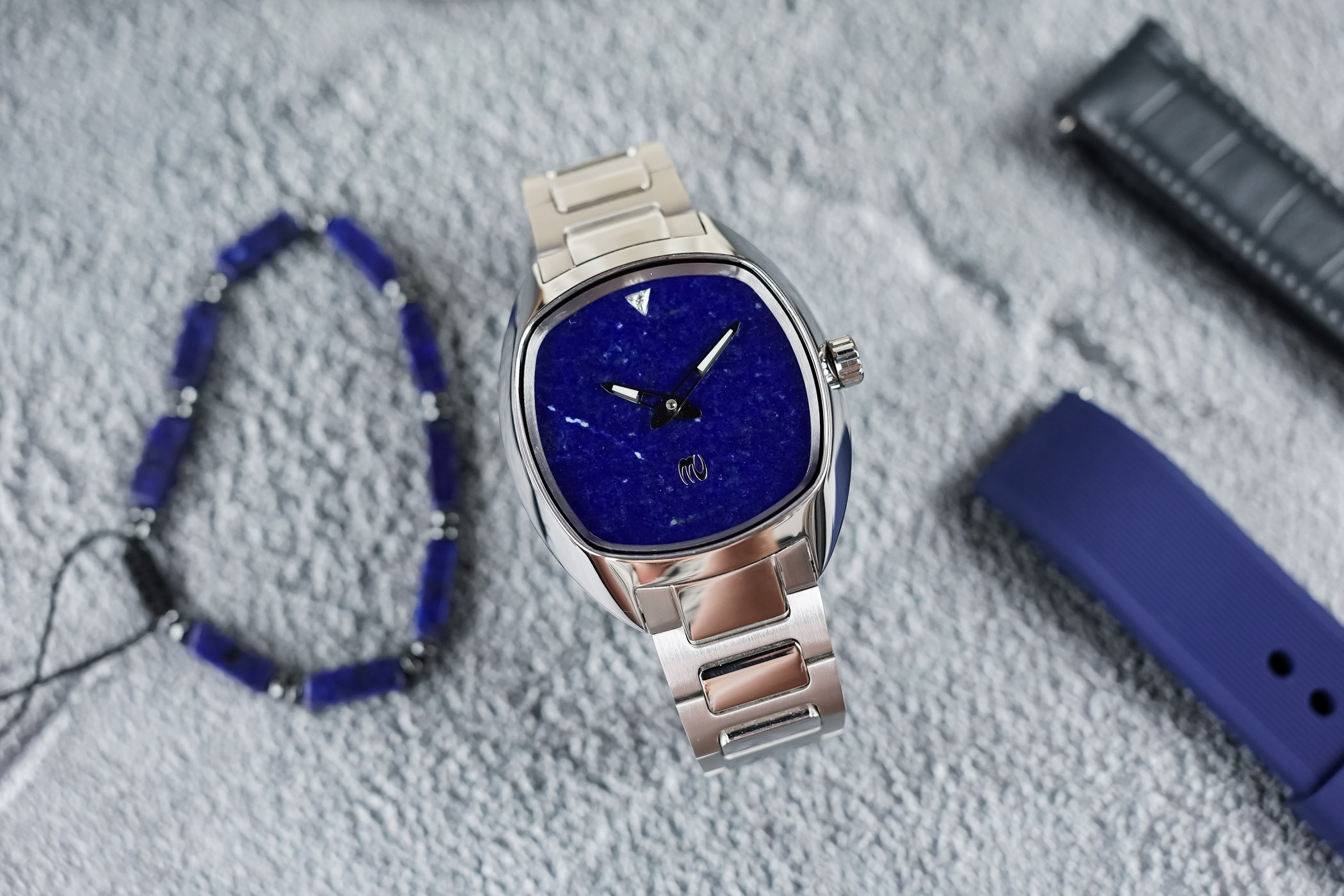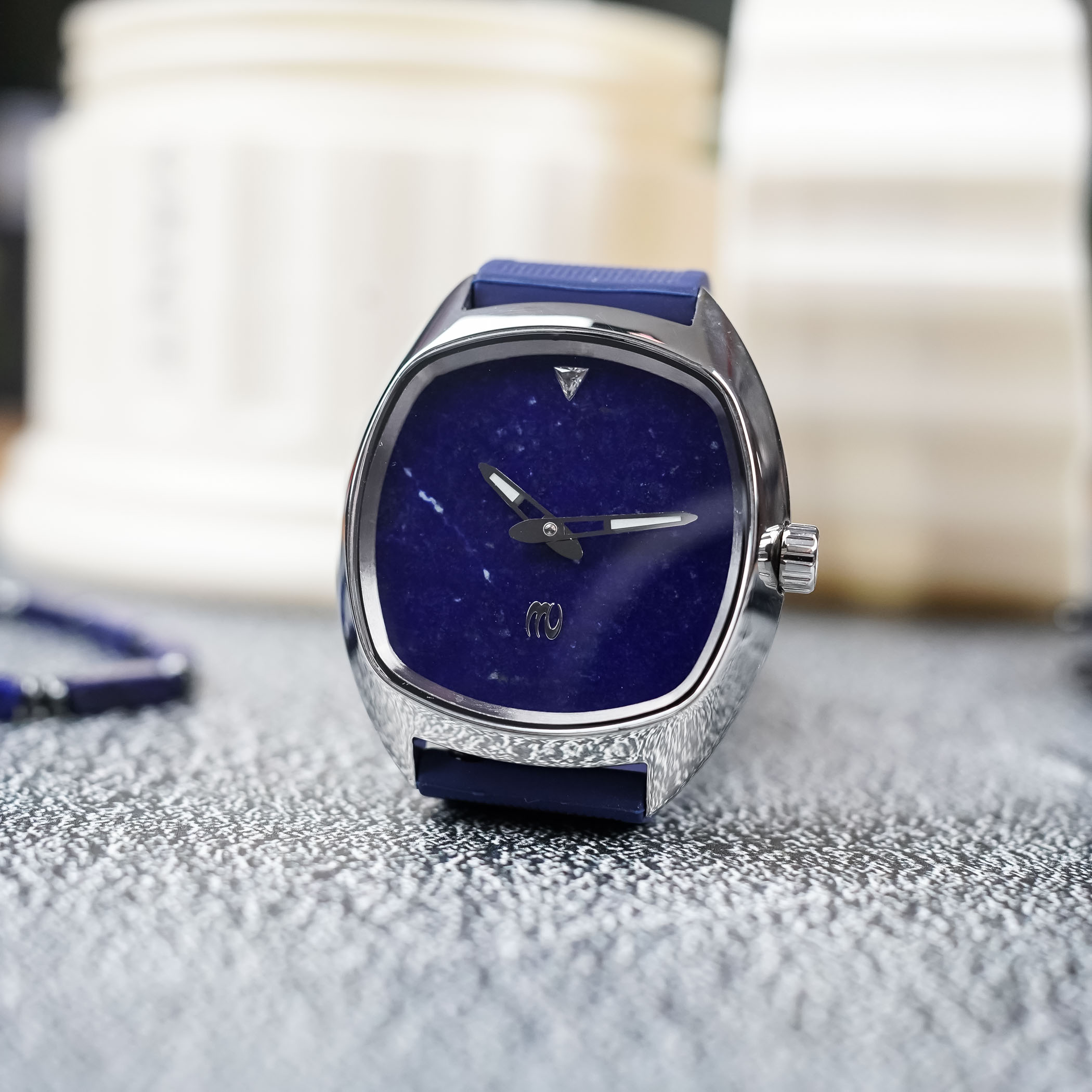 A unique case, brilliant blue lapis lazuli dial and tiny diamond highlight the latest piece from the young Greek brand.