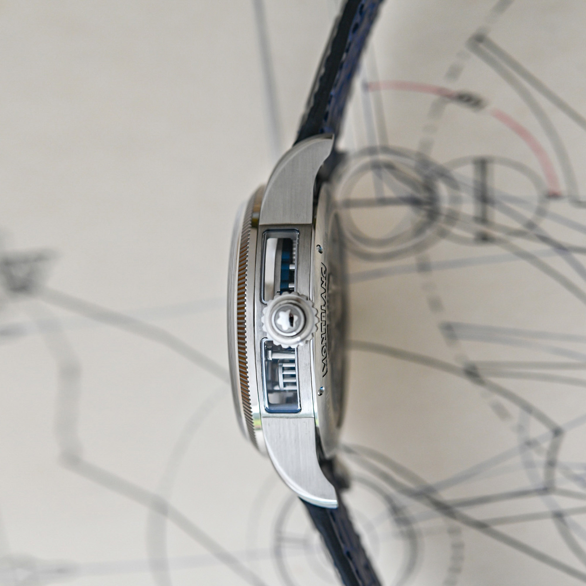 Jokes aside, the large, 38.4mm movement comprising 291 parts is impeccably finished, with blue-plated plates and bridges providing a notable contrast to the gold-plated going train wheels and the 14.5mm diameter balance wheel with screws. The column wheel is hard to miss. With this watch’s transparency, you can test your knowledge of chronograph movements by identifying the visible parts – an exercise worthy of a sophisticated idle fellow like yourself. You might also appreciate the subtle details, such as the tiny arrow painted onto the hour hand and the blue arrow-shaped tip of the chronograph minutes totalizer. The chronograph’s central seconds hand also sports the same blue hue, adding to the overall harmony of the design.