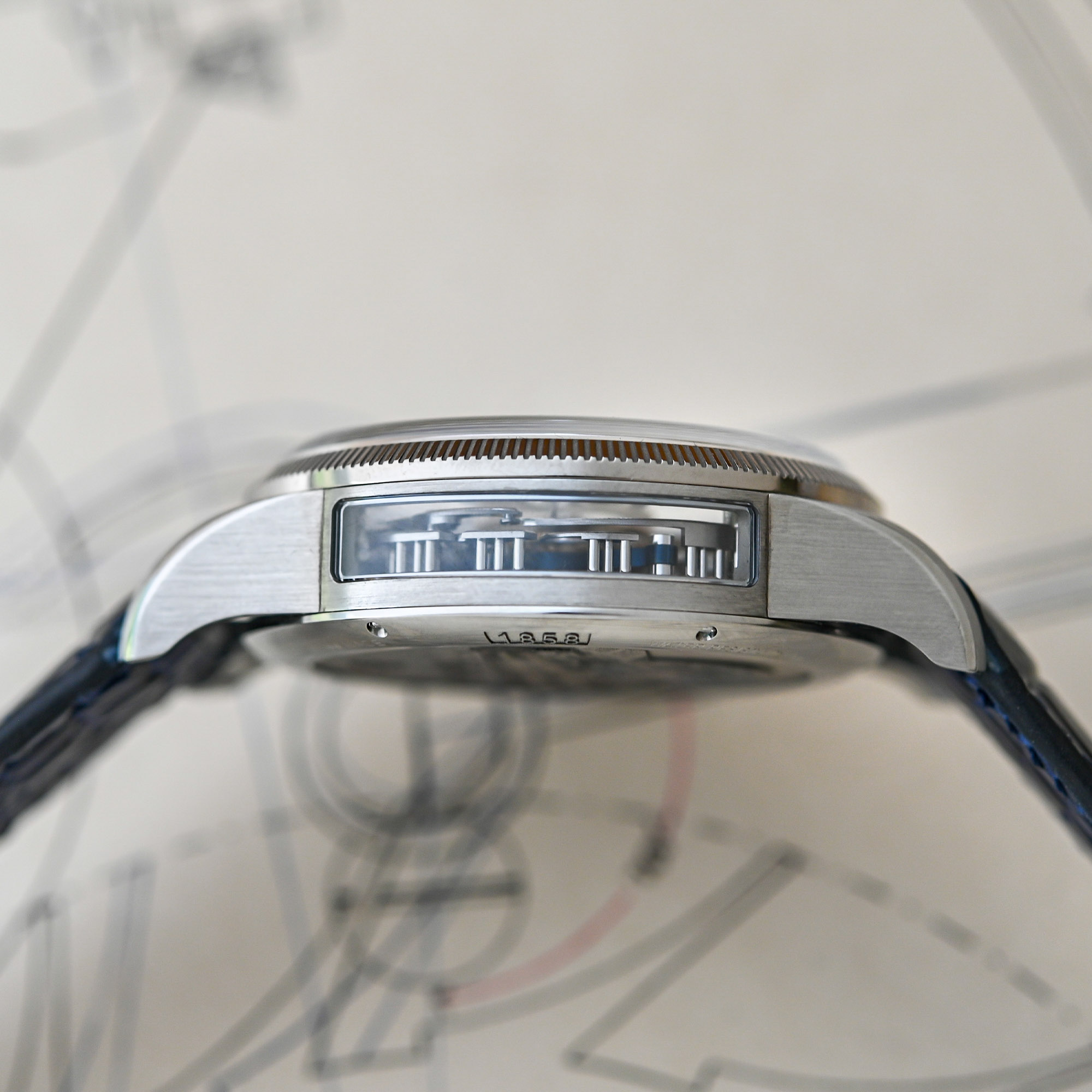 The new Unveiled Minerva Monopusher Chronograph is an openworked piece of horology. Typically, openworked designs focus on the dial or movement, but this timepiece extends the concept to its 43mm stainless steel case. Featuring a fixed white gold fluted bezel, a nod to Minerva’s 1927 design, the case combines a satin and polished finish and maintains the same shape as the 2023 Unveiled Secret, albeit slightly thicker (14.78mm vs 14.18mm).