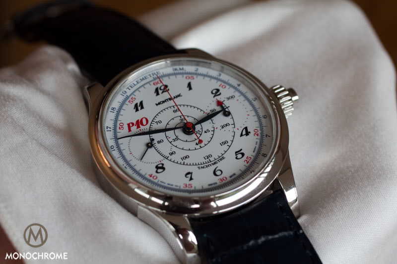 The dial shows a coiled or snail scale that was a typical feature on the legendary Minerva chronographs from the 1920s and 1930s. The periphery of the Montblanc P10 dial features a telemeter scale, so the tachymeter scale is placed in the centre, where it is coiled like a snail’s shell.
