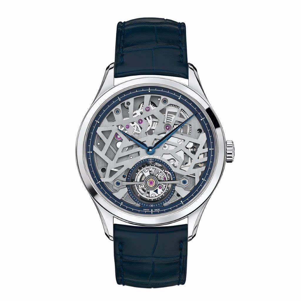 Quick facts: 40mm x 8.90mm 18k white gold case – 30m water-resistant – openworked dial with blue hands and tracks – blue alligator strap (Montblanc Pelletteria) with 18k white gold pin buckle – automatic calibre MB 29.24 with micro-rotor and one-minute Exo Tourbillon, 48h power reserve, 3Hz frequency – fully openworked