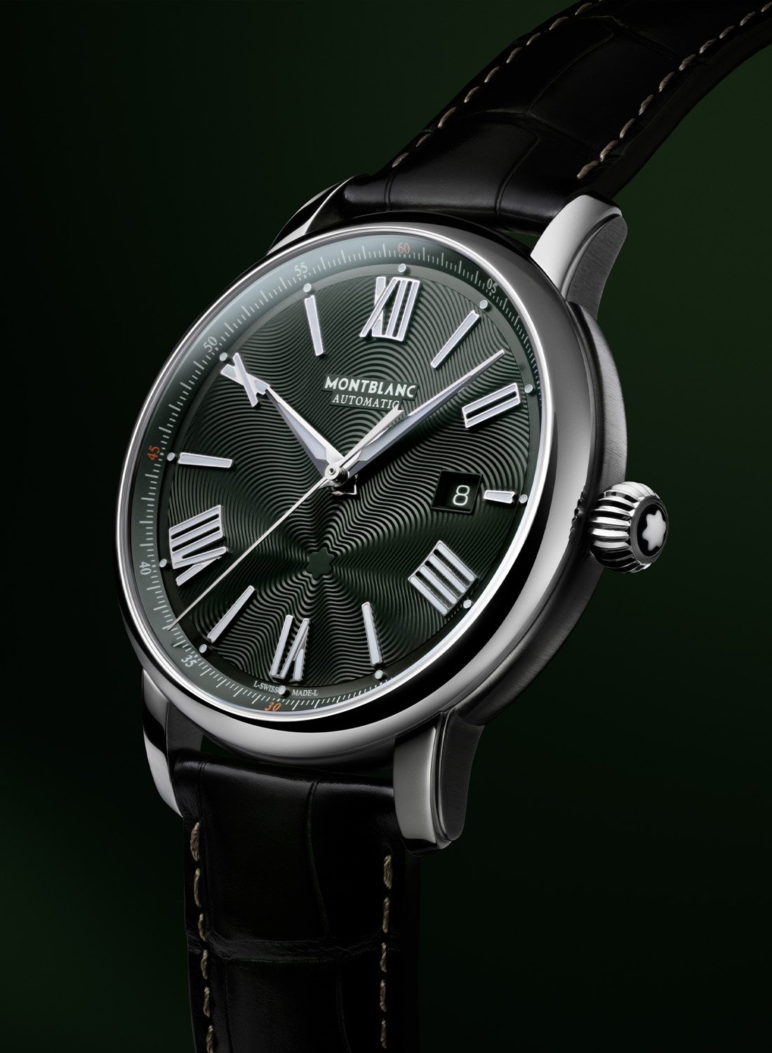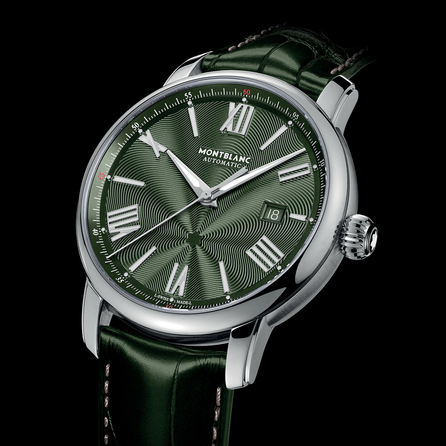 The new green dials feature the star-shaped representation of the Mont Blanc emanating in a succession of swirling grooves from the lower half of the dial. Although the word ‘guilloché’ is mentioned, the mesmerising exploding star pattern is produced using a special stamping process. The large Roman numerals are rhodium-plated and treated with Super-LumiNova, matching the sword-shaped hands. The sloping sunray-brushed flange with the precision minutes/seconds track has white markers, a discreet touch of orange every fifteen minutes and small luminescent dots highlighting the hour markers.