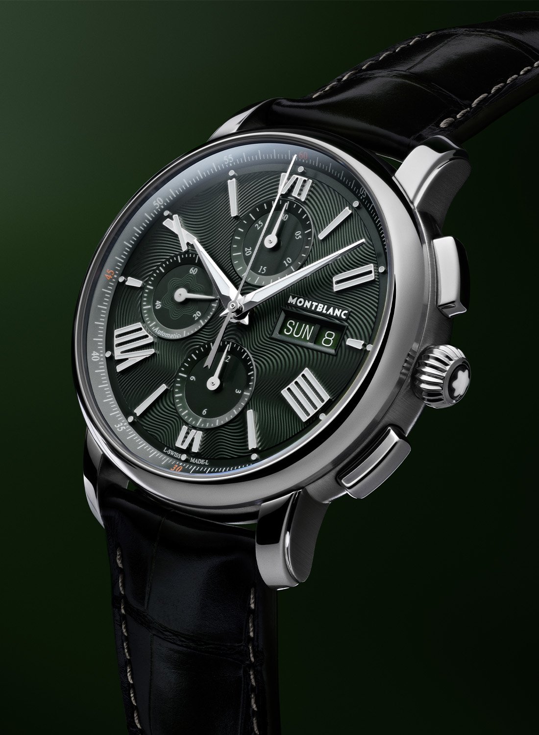 In addition to the 12-hour and 30-minute totalisers of the Chronograph reference, this model also comes with a large day & date display in a rectangular aperture at 3 o’clock with a green background. A nice detail is the Montblanc exploding star featured inside the small seconds at 9 o’clock. Contrasting with the swirling pattern of the dial, the three sub-dials have smooth sunray-brushed interiors and scales. The automatic calibre MB 25.07 (Sellita SW500-1) beats at 28,800vph and has a slightly higher power reserve of 42 hours.