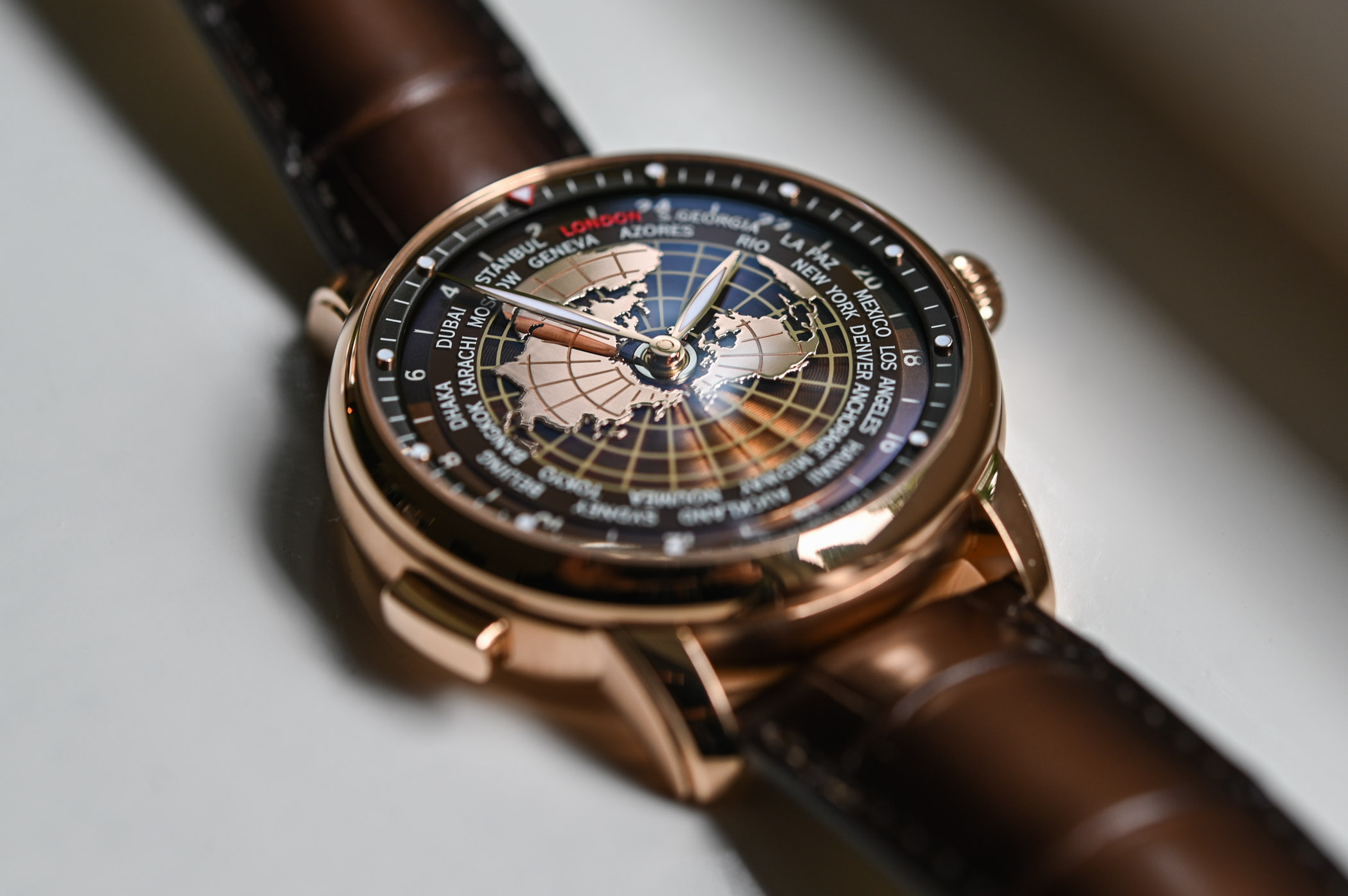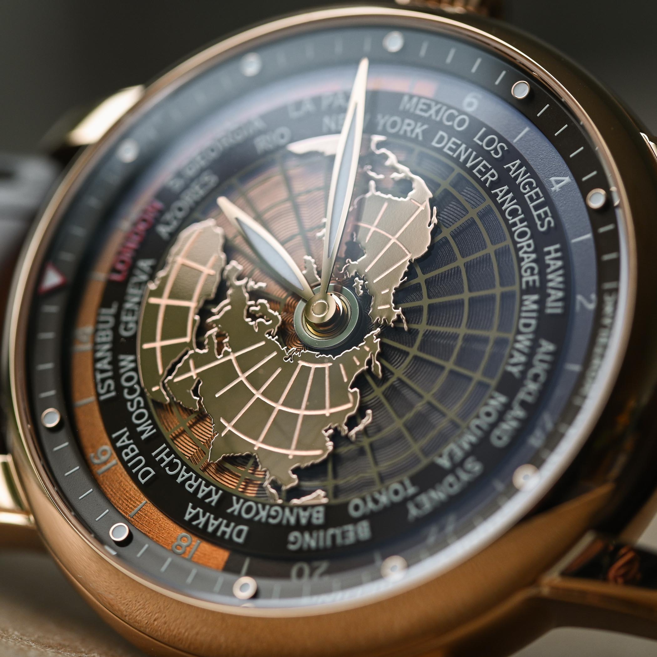 The dial is the star of the show, updated from the 2016 model, with dual rotating discs and a gold/brown colour scheme to complement the gold case. The oceans are depicted by a flinqué-froissé guilloché pattern in light and dark brown between the hours of 6 and 18 for day and night. This lower disc rotates independently of the upper sapphire disc that displays the three-dimensional continents (not simply printed) and meridian lines in gold, along with 24 world cities printed in white – London is in red. The bottom disc also has white Arabic numerals at the perimeter for 24-hour time, shown in two-hour increments. Leaf-shaped gold hour and minute hands are filled with white Super-LumiNova.