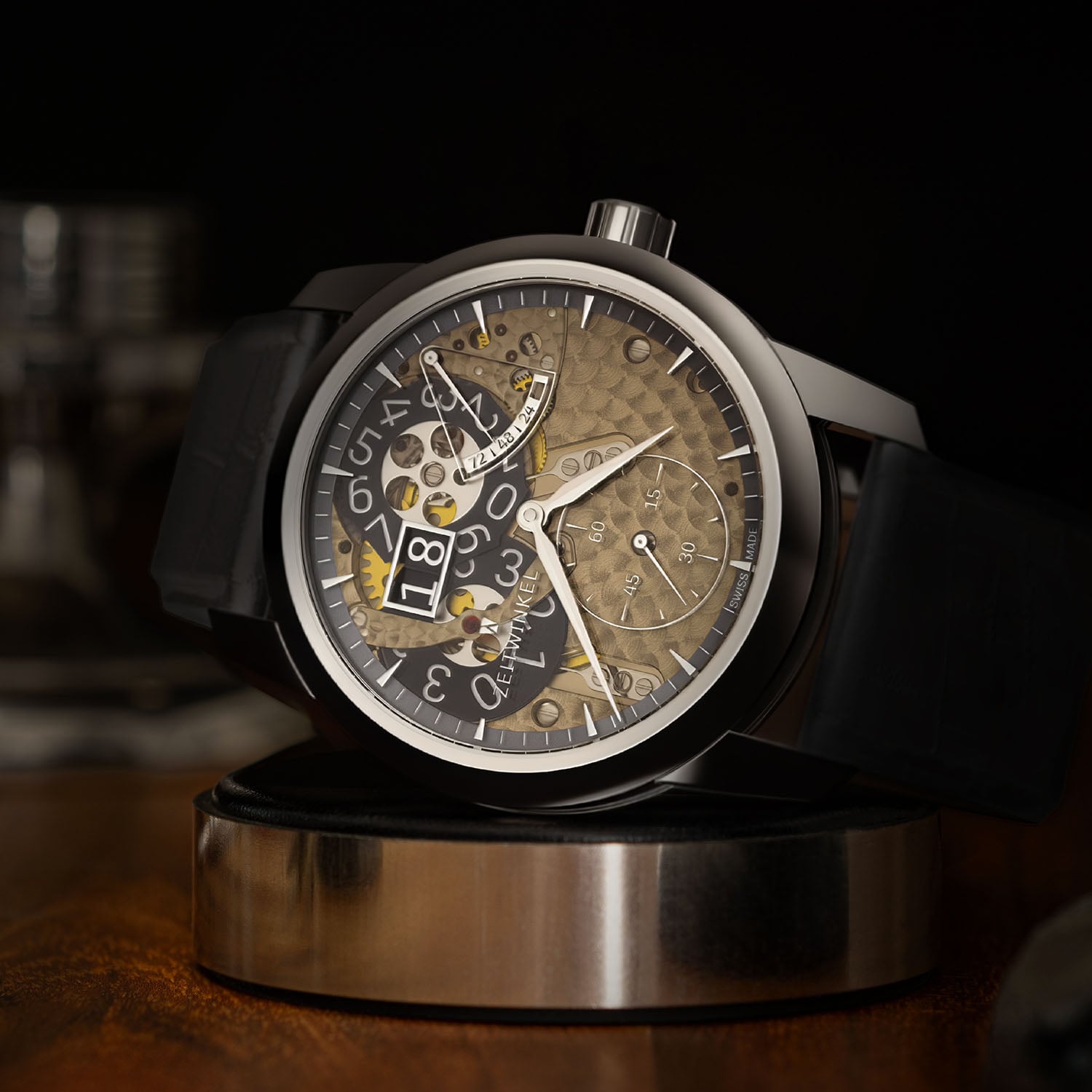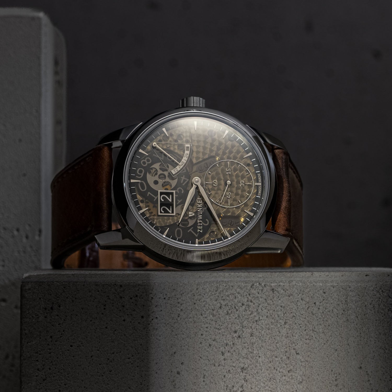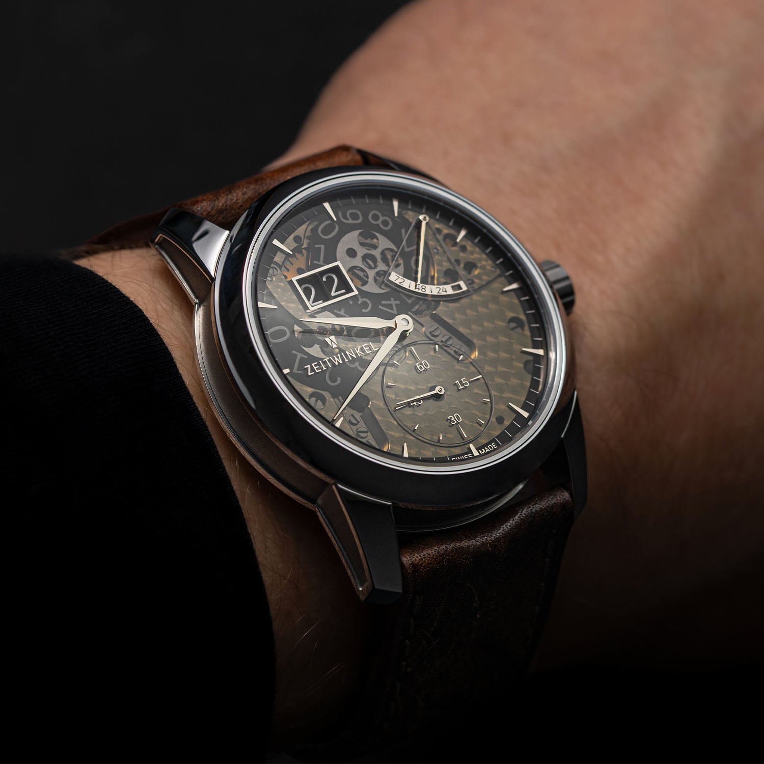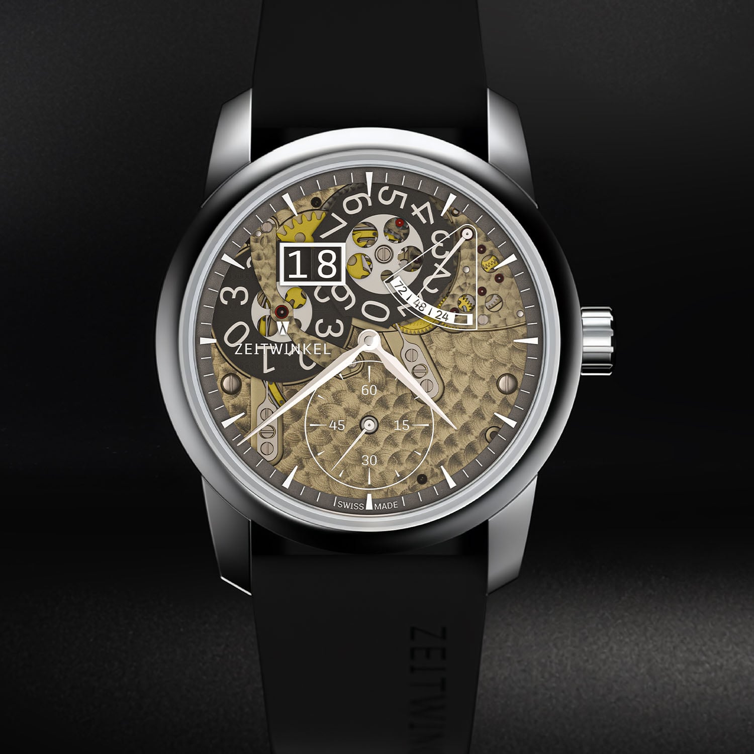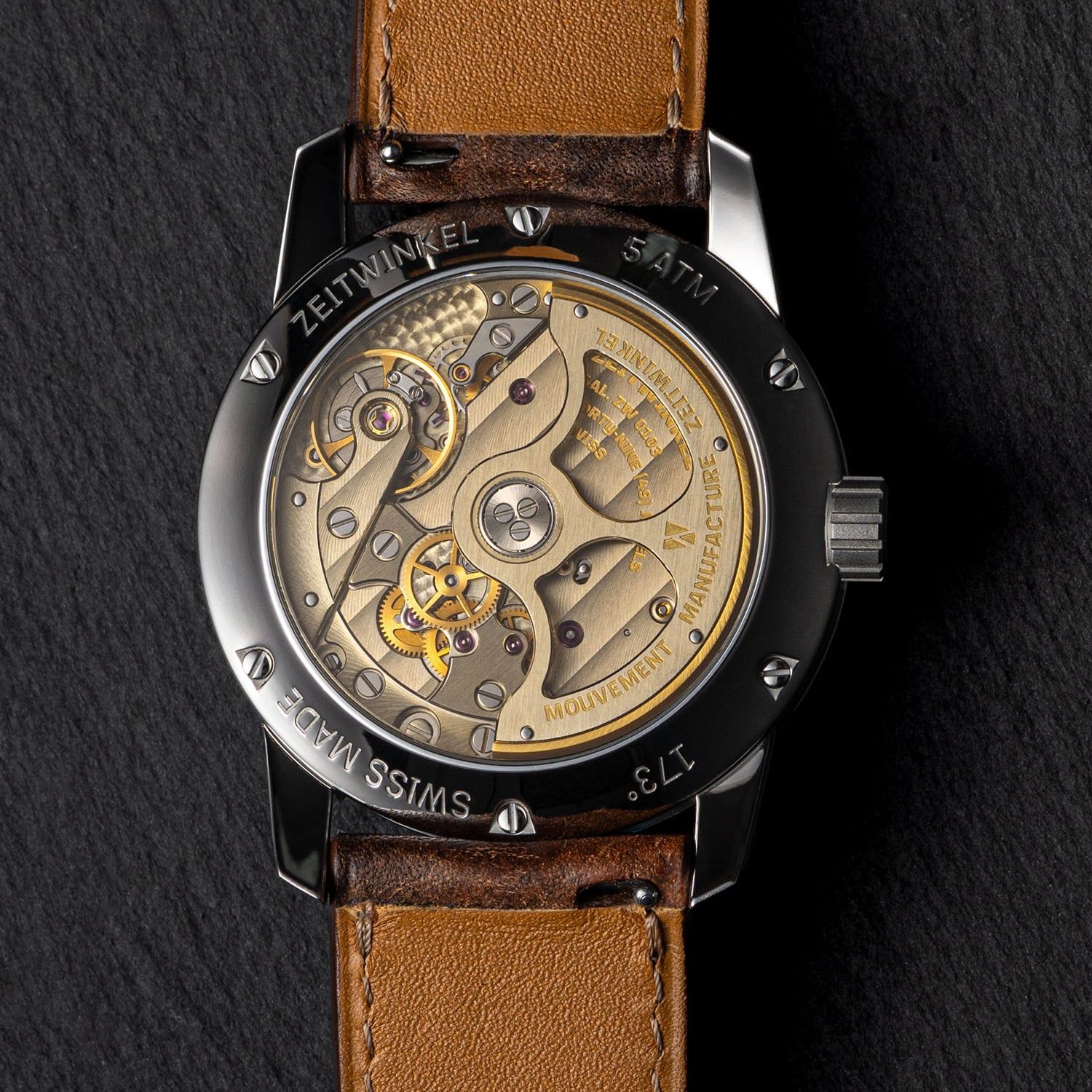 The new Zeitwinkel 173° is powered by the same in-house calibre ZW0103, linking both generations. This automatic movement, previously exclusive to the 273° collection, comprises 387 components and is defined by its patented large-date display and a construction based on untreated German silver plates and bridges (frosted finish on the upper side is available upon request). The material’s warm, champagne-like tone and responsiveness to finishing remain central to the identity of the watch. Operating at 28,800 vibrations/hour and delivering a 72-hour power reserve, the movement is technically solid and visually expressive, with traditional finishing.