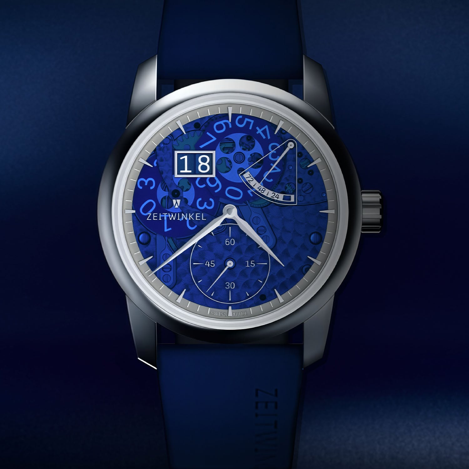 As with the original 273°, Zeitwinkel uses sapphire to reveal the upper side of the movement. Two versions are offered: Saphir Fumé, echoing the smoked aesthetic of the original, and Saphir Bleu, a more contemporary, light-reactive interpretation. The dial elements are metallised and grown directly onto the sapphire surface using lithographic techniques (LIGA), maintaining clarity and legibility while allowing a view of the mechanics beneath. The large date remains at 11 o’clock, a signature layout already seen on the 273°, though now seemingly in a cleaner, better-integrated composition, still with the dial-side power reserve indication.