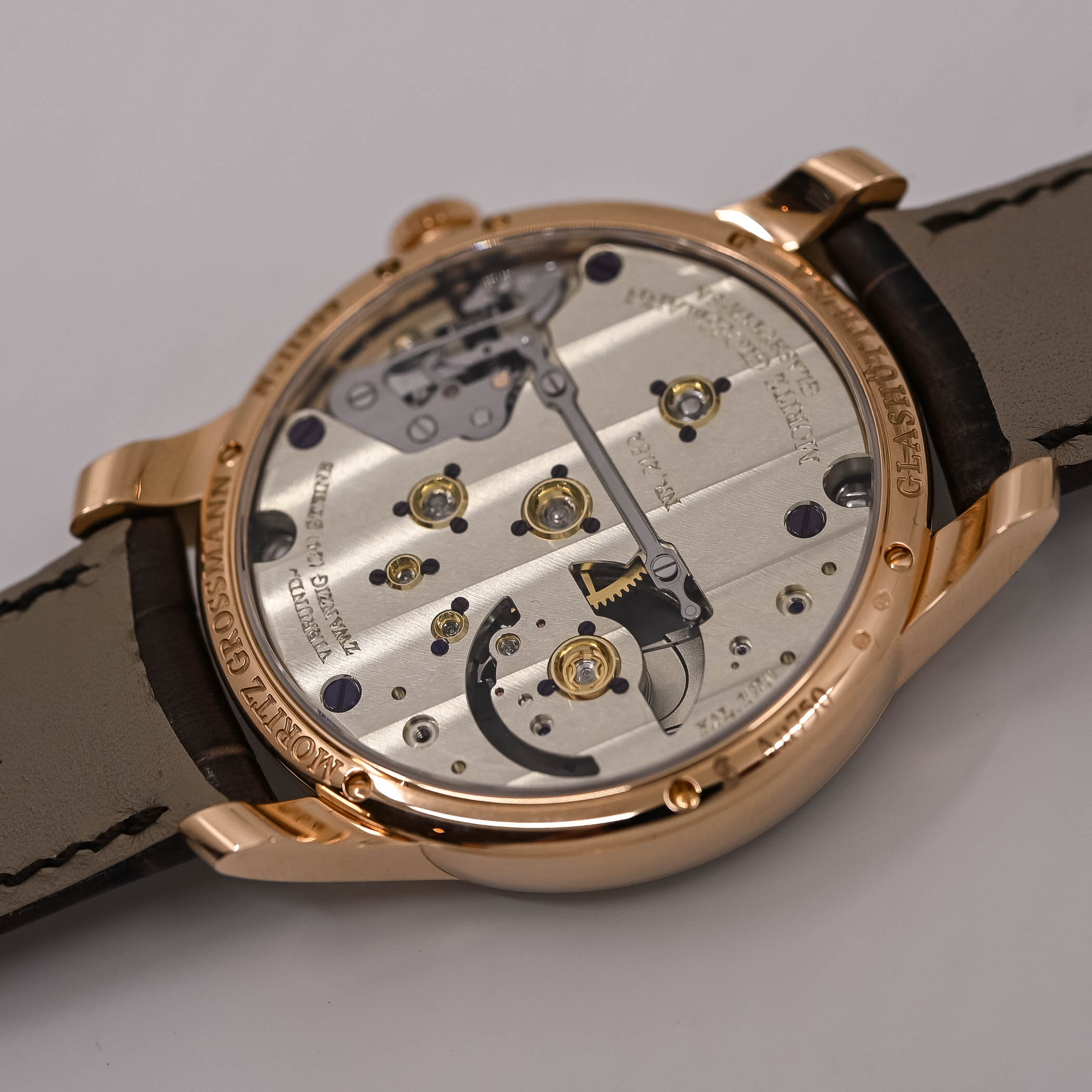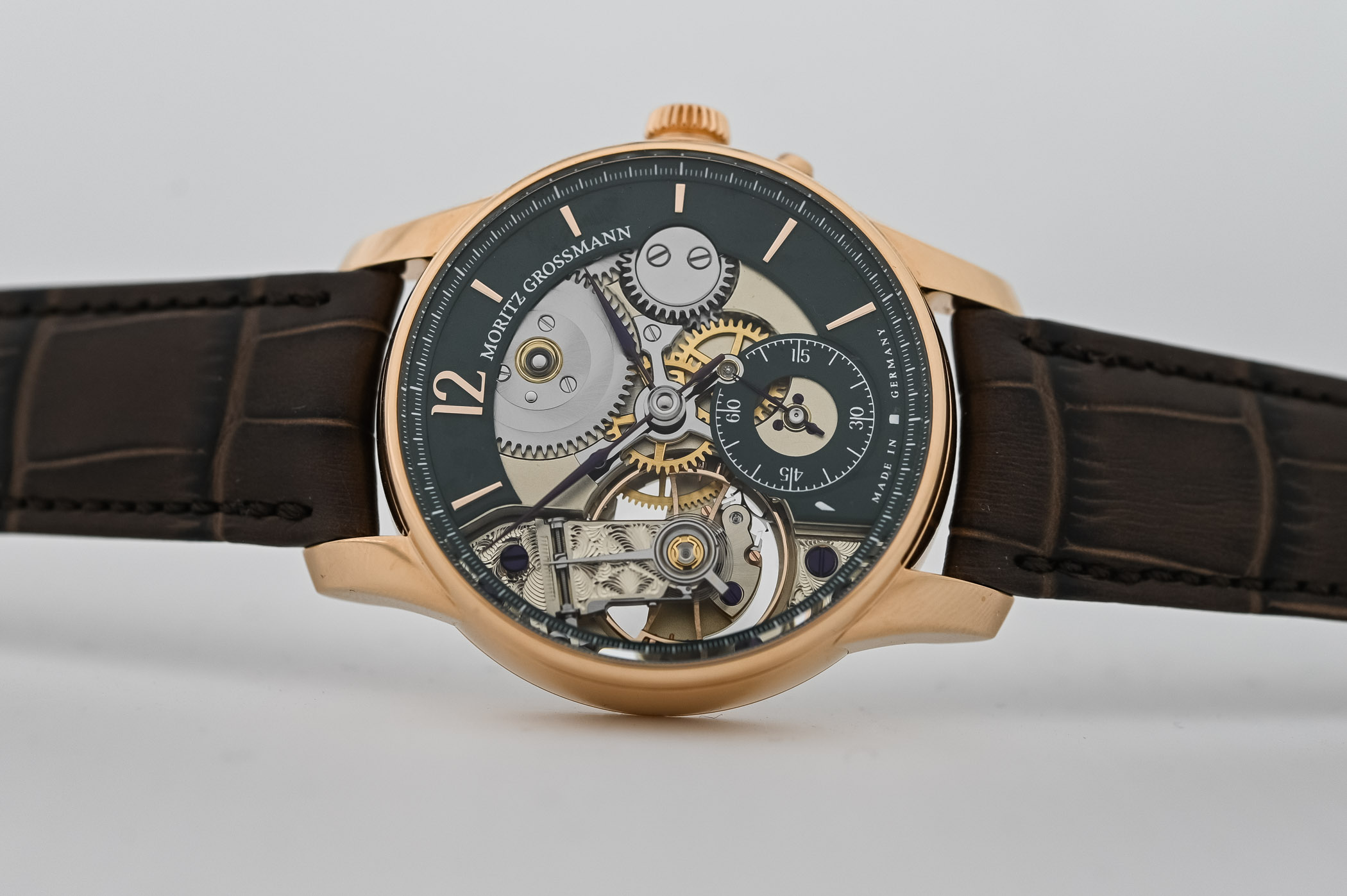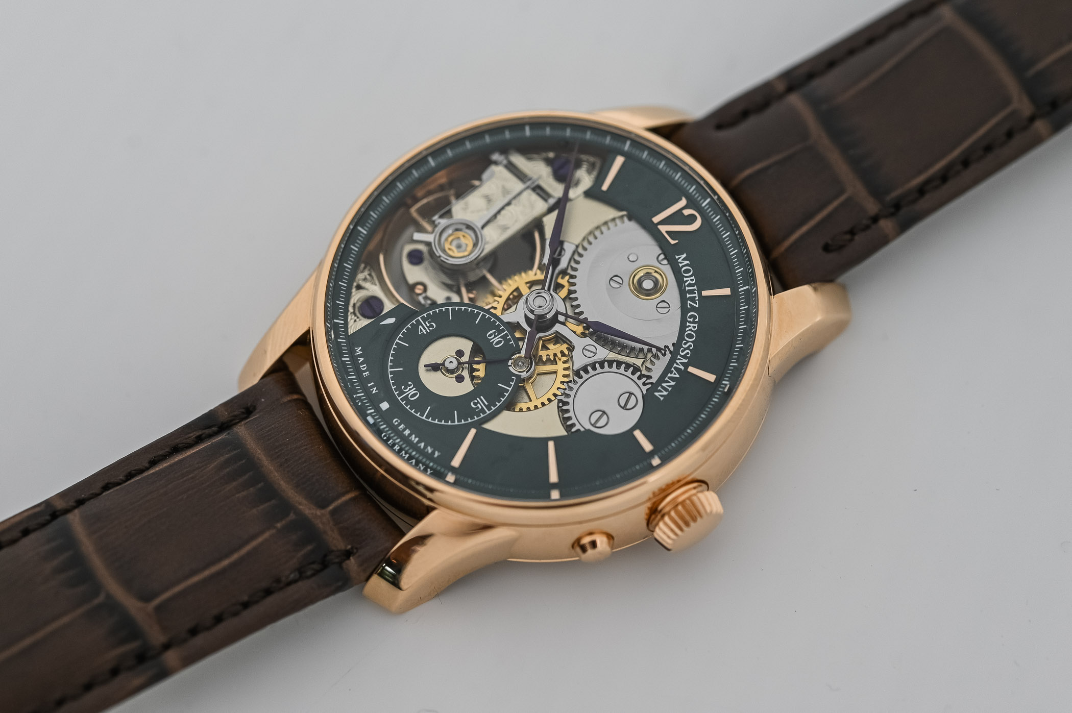 The Moritz Grossman Backpage Green in rose gold boasts a fully polished case with curved sides, spanning 41mm in width and 11.35mm in thickness. Its elongated, sculpted lugs complement the design, and when paired with the hand-stitched alligator strap closed by a rose gold pin buckle, it sits comfortably on the average wrist. The ribbed screw-in crown, featuring a polished top, is positioned at 3 o’clock, accompanied by a pusher below that addresses a practical issue. In these watches, the keyless work is built differently to protect it from external elements and any unintended movement of the hands. Grossmann’s patented winder and pusher system is incorporated into the keyless works. Pulling out the crown makes the movement stop entirely, but the crown immediately jumps back into place when released. You can then set the hands to the correct time and press the pusher to reactivate the movement. Engaging the pusher seamlessly transitions the crown back to winding mode rather than time-setting mode. This innovative approach prevents any unintended movement of the hands, a common occurrence when the crown is pushed back in.