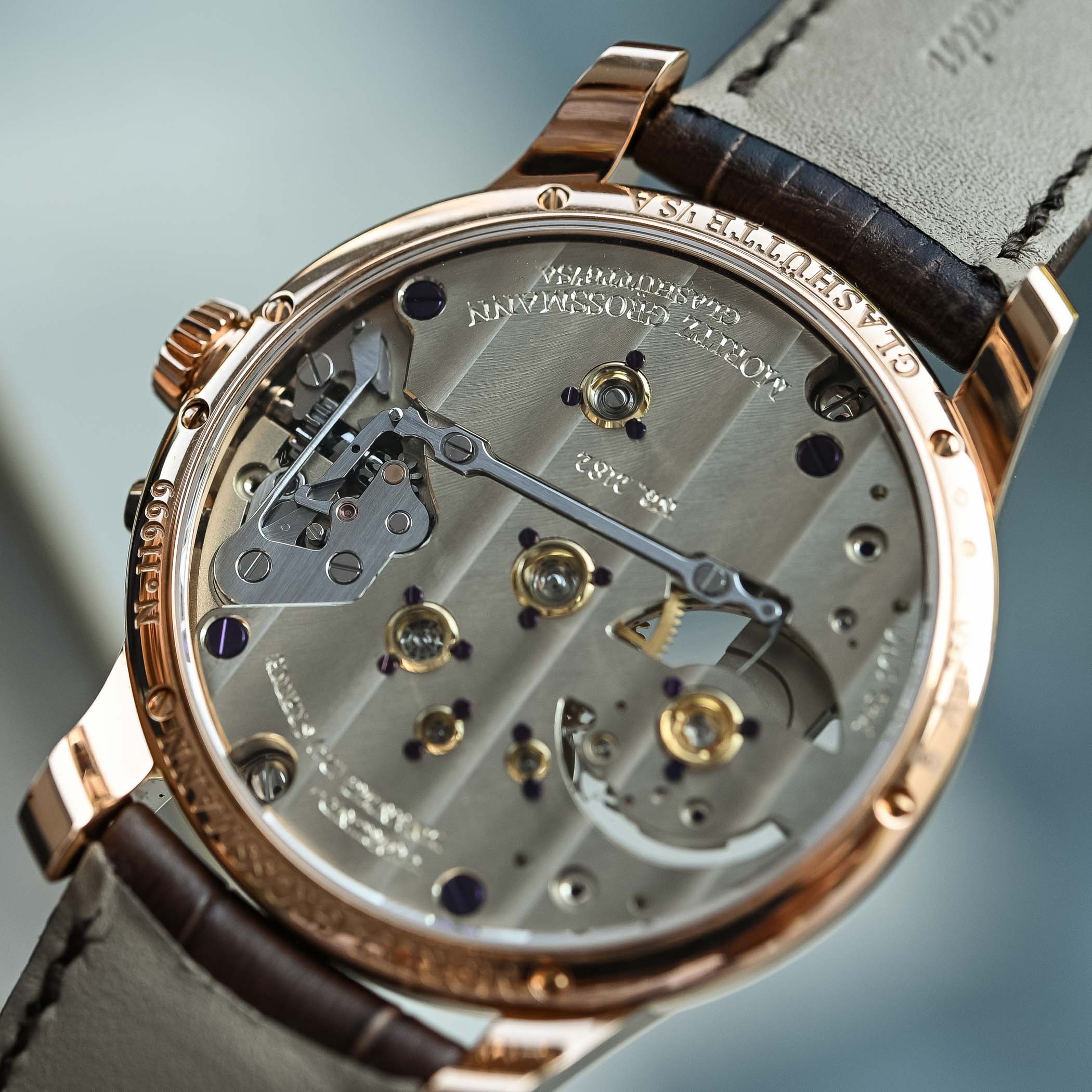 The watch is powered by the hand-wound manufacture calibre 107.0, operating at 18,000 vibrations/hour with a power reserve of 42 hours. The movement, a reworked version of Grossmann’s calibre 100 used in the Tremblage models or the Power Reserve Vintage, has been ingeniously reoriented to showcase its aesthetic allure on the dial side. Still, the caseback crystal has plenty to reveal – the dial usually hides this movement’s side image.