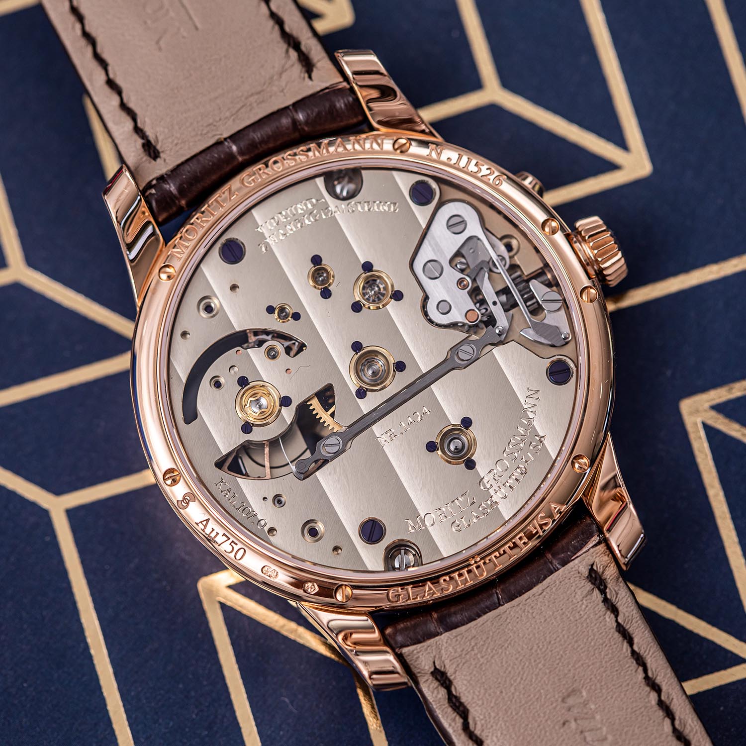 Another common trait in all calibres by Moritz Grossmann is the use of untreated German Silver for the plate and bridges, which has a warm, champagne tone. Often the calibres are treated with German ribbing, comparable to Geneva stripes, but in the Moritz Grossmann Backpage Transparent, the plates have been finished with the brand’s own ribbing.