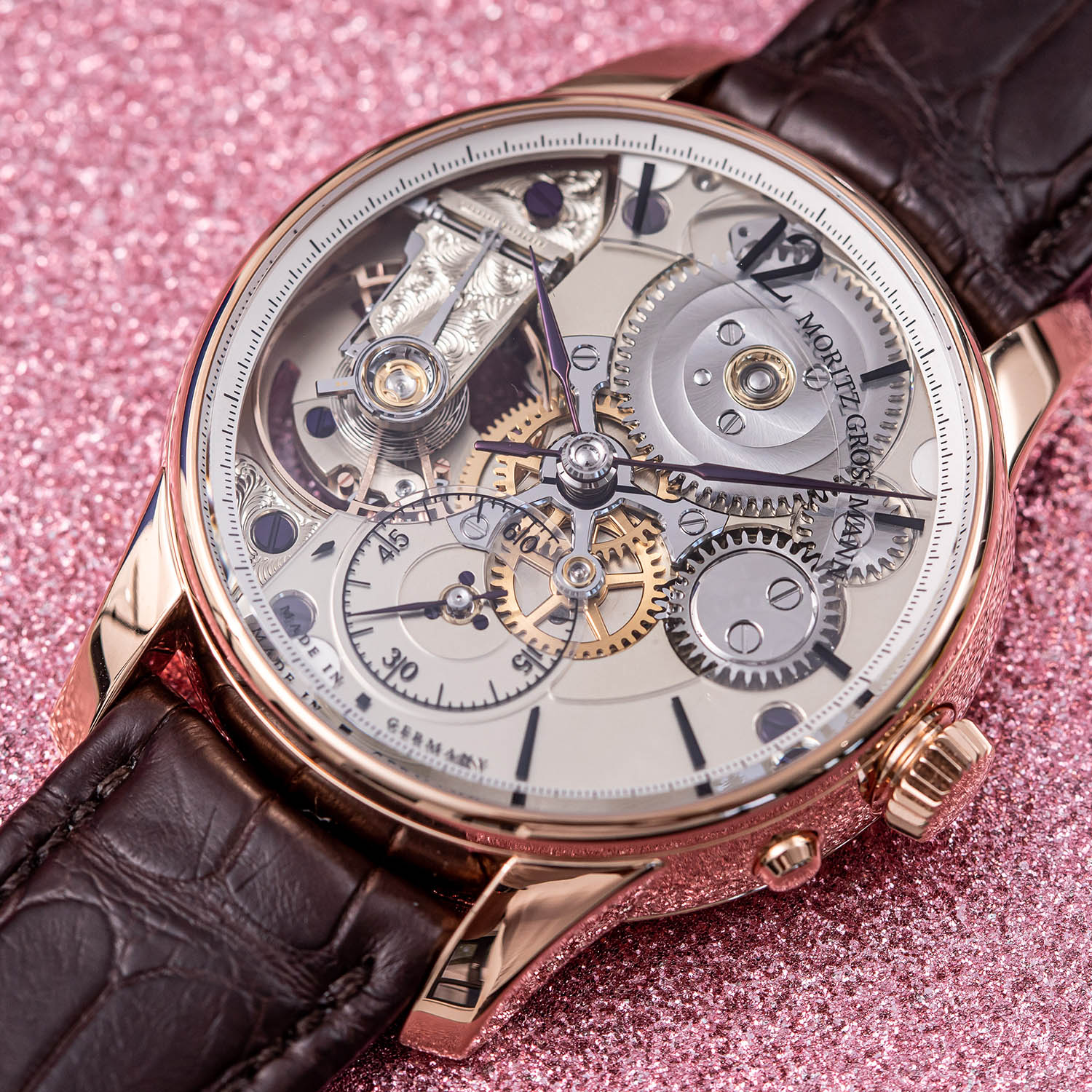 The Moritz Grossmann Backpage Transparent is limited to only eight pieces in each version. The watch comes on a handmade dark brown alligator leather strap with rose gold or white gold pin buckle. The retail price is set at EUR 48,400.