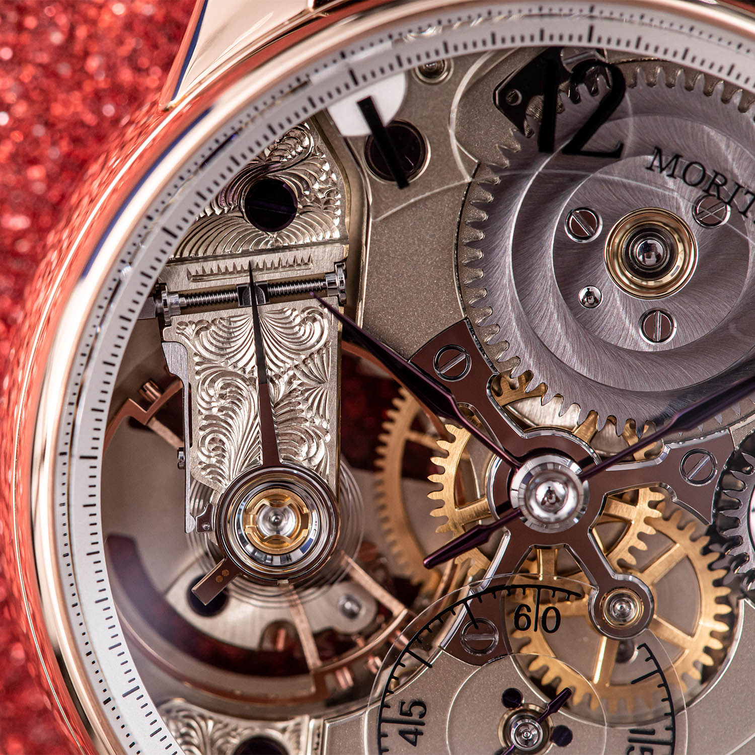 The construction of the entire calibre 107.0 is mirrored, to explain it in the most simple way, and is essentially a calibre 100.1 in reverse. When you want to flip a movement to display the gear train, escapement and other bits normally only visible through a transparent caseback on the front of the watch, you might encounter a few issues. The most important one is the rotational direction of all the wheels. If not corrected, it would result in the hands running counter-clockwise. Moritz Grossmann reworked the calibre 100.1 to reroute the rotational direction so it will run clockwise again. An extra wheel is positioned between the crown wheel and ratchet wheel. Other than that, the construction of the entire escapement is different too. On one hand, it needed to be reworked to fit with the redesigned 3/4 plate and on the other hand, the escapement and direction of the coiling of the balance spring are mirrored too. The balance cock is hand-decorated with a floral engraving, as is common in all Moritz Grossmann movements.