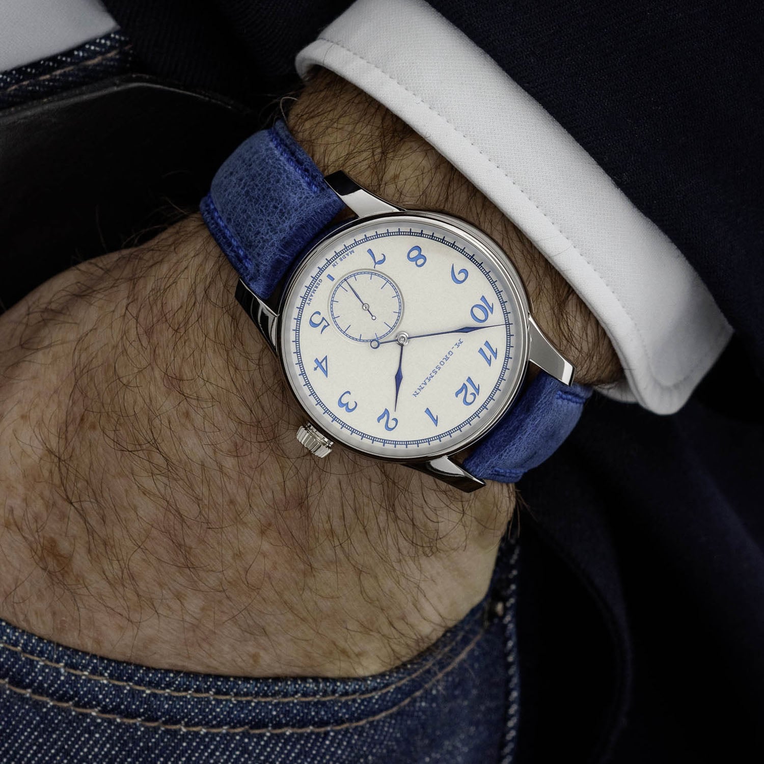 As for the dial, Moritz Grossmann calls this finish “silver-plated by friction”. It is a traditional, hand-applied technique where the surface is worked with pastes and powders, and the result is a fine, grainy texture that doesn’t reflect too much light, keeping things soft on the dial. The blue numerals and scales come out nicely against this surface, along with a vintage-style M. Grossmann logo. This version also switches to Arabic numerals, replacing the Roman numerals seen on earlier Hamatic iterations. Time is shown with central hours and minutes and small seconds at 6 o’clock, with slender, hand-made steel hands heat-blued to match the numerals and markers.