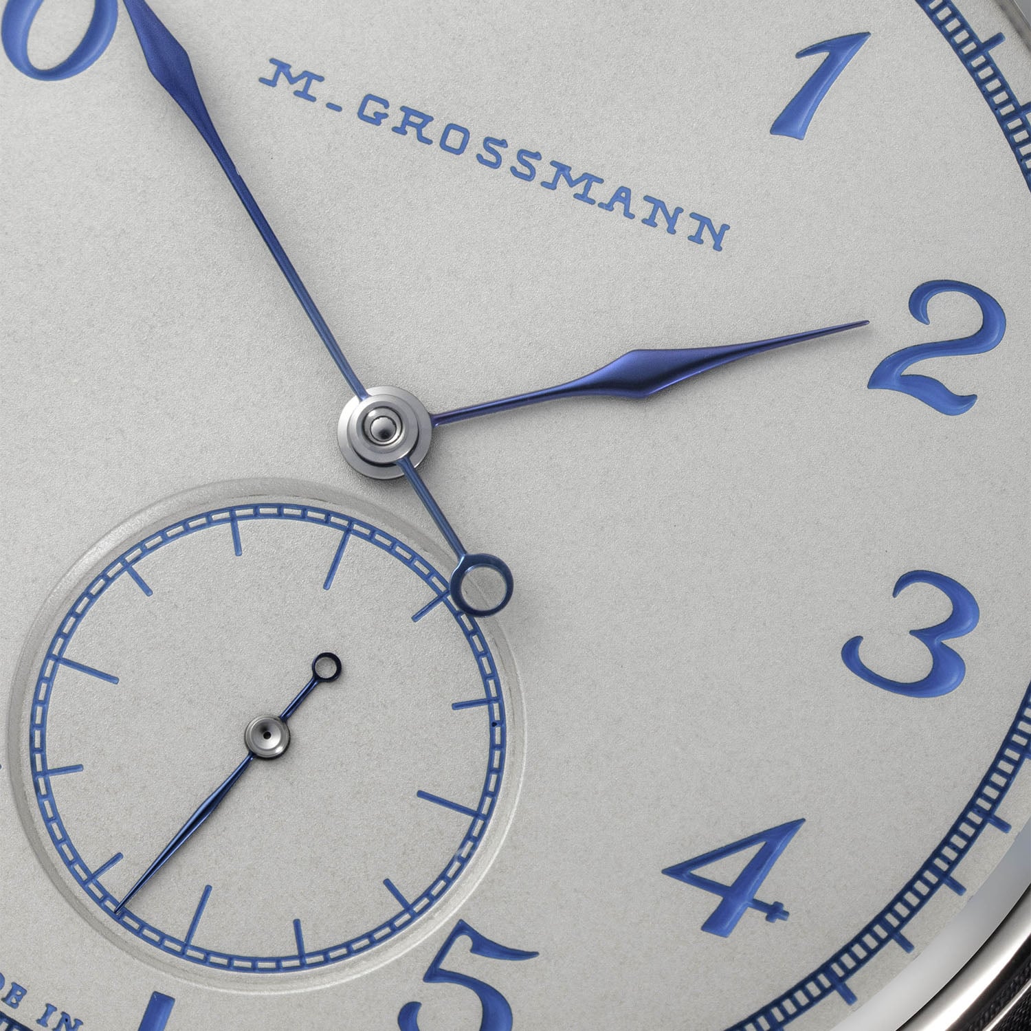 As for the dial, Moritz Grossmann calls this finish “silver-plated by friction”. It is a traditional, hand-applied technique where the surface is worked with pastes and powders, and the result is a fine, grainy texture that doesn’t reflect too much light, keeping things soft on the dial. The blue numerals and scales come out nicely against this surface, along with a vintage-style M. Grossmann logo. This version also switches to Arabic numerals, replacing the Roman numerals seen on earlier Hamatic iterations. Time is shown with central hours and minutes and small seconds at 6 o’clock, with slender, hand-made steel hands heat-blued to match the numerals and markers.
