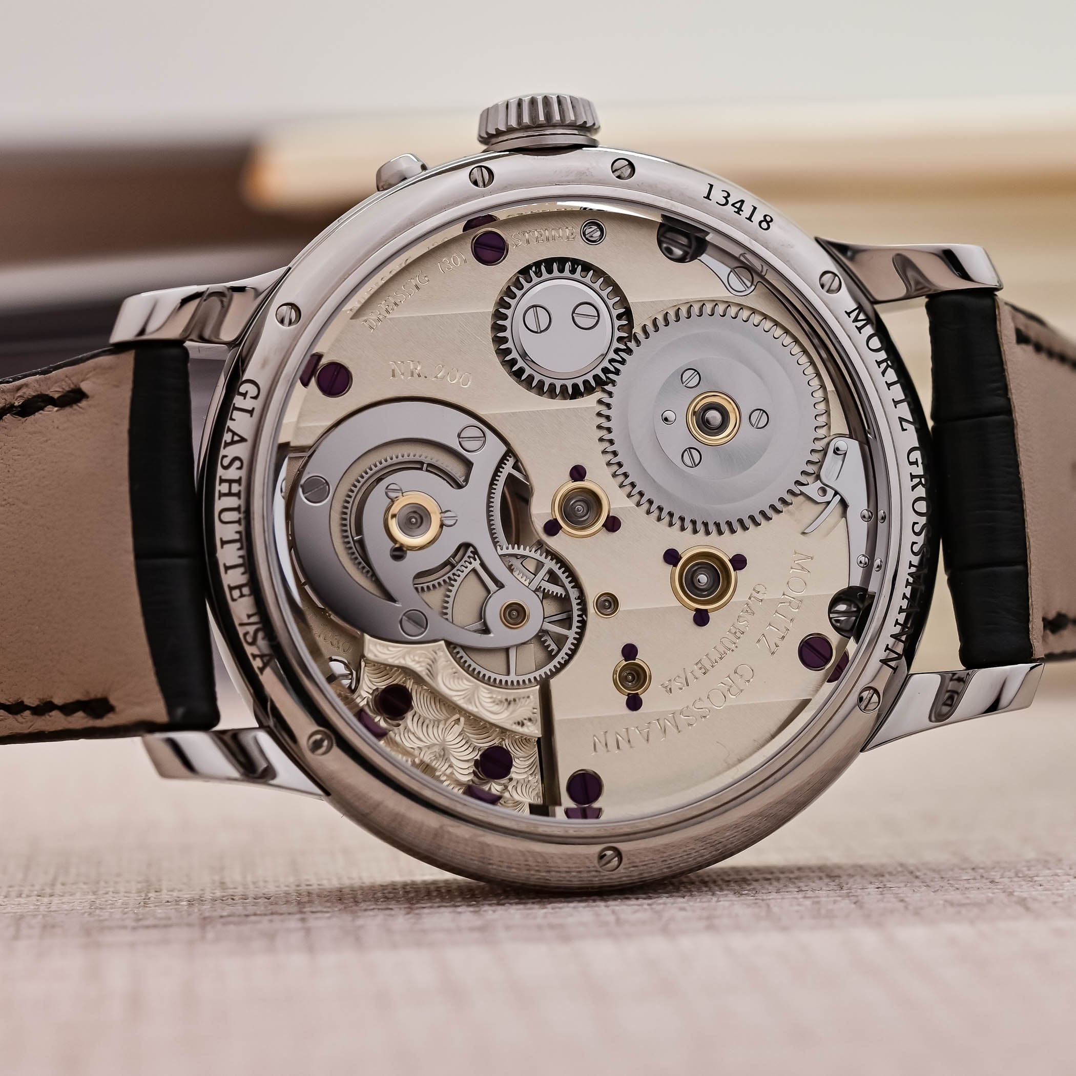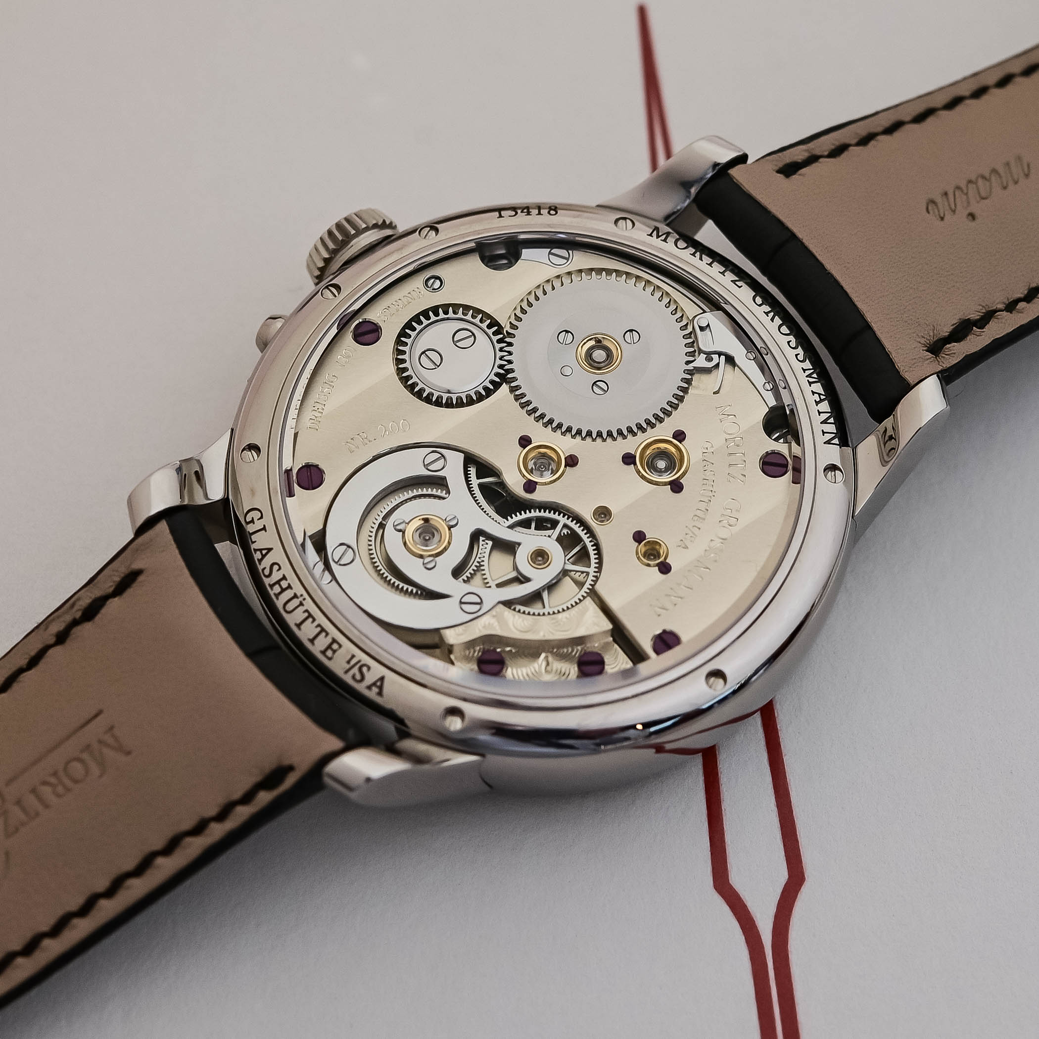 Turning the watch over reveals the “same old” calibre 103.0, a hand-wound movement with untreated German silver plates featuring broad Glashütte ribbing, with hand-engraved flourishes on the plate and tourbillon cock. Gold chatons, secured by polished screws, hold white sapphire jewels, while the ratchet wheel features three-band snailing. The balance beats at a traditional 18,000 vibrations/hour, and the movement delivers a 72-hour power reserve. A signature Grossmann feature is the pusher-activated manual winder, separating hand-setting from restarting the movement, complemented by a stop-seconds mechanism acting directly on the human-hair brush balance rim.