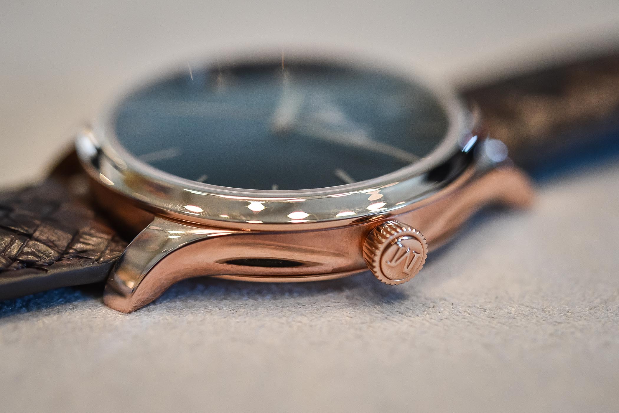 Hands and indexes are also classical to the brand, with elongated and polished leaf hands combined to faceted applied indexes. Overall, thanks to the fumé dials, the Endeavour Centre Seconds Automatic doesn’t feel empty or too clean. On the contrary, these watches are lively and play intensively with the ambient light. The cases, here made of 18k white or 18k red gold, are modernly but reasonably proportioned: 40mm in diameter, 10.7mm in thickness. A perfect all-rounder. They show more dynamic curves and revamped lines, compared to older watches of the brand, yet they keep the overall distinct shape that create elegance and originality, with a concave bezel and concave casebands. Some parts are polished, some are vertically brushed, creating a rather dynamic case – and we know that a classical watch with a classic case can sometimes feel boring.