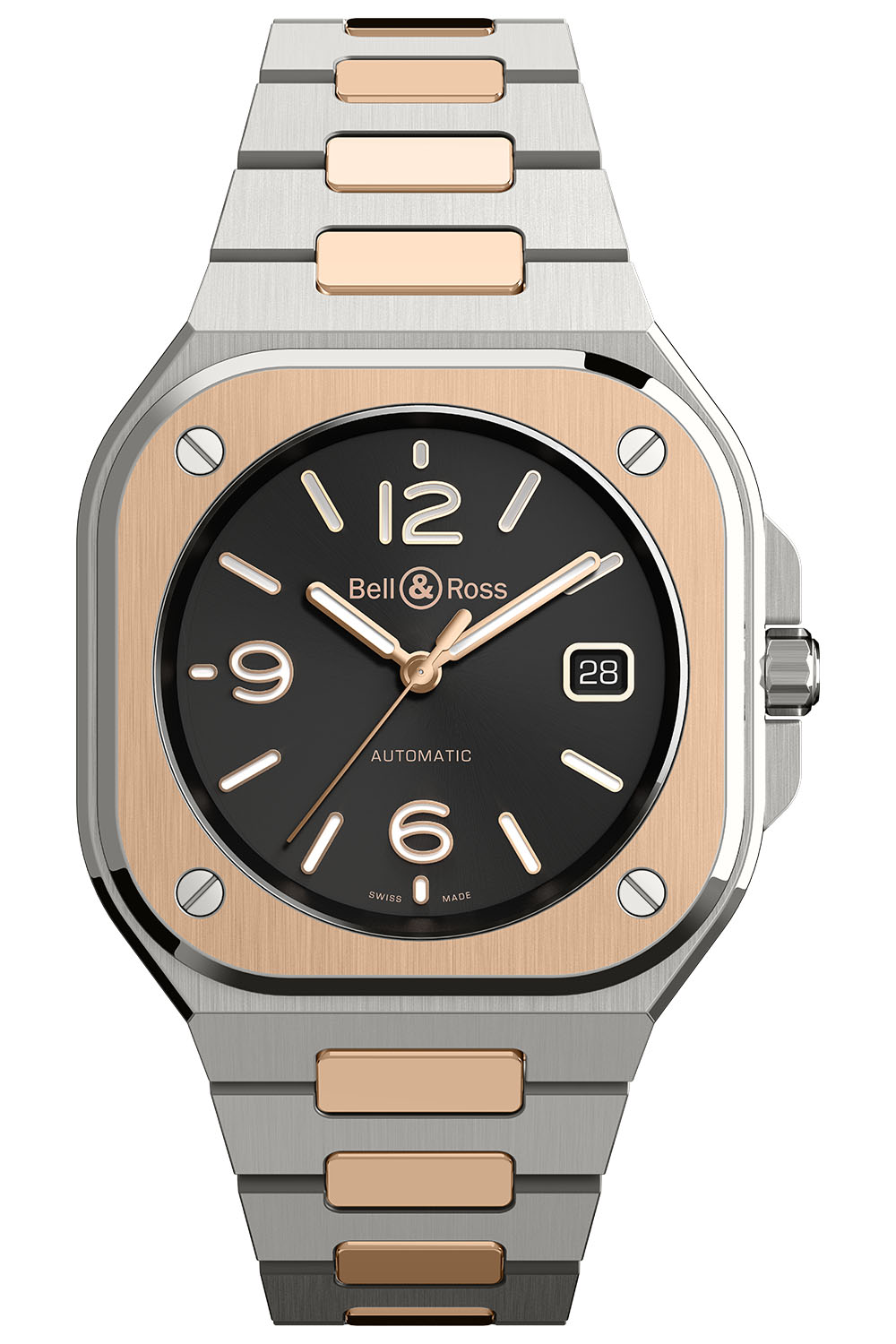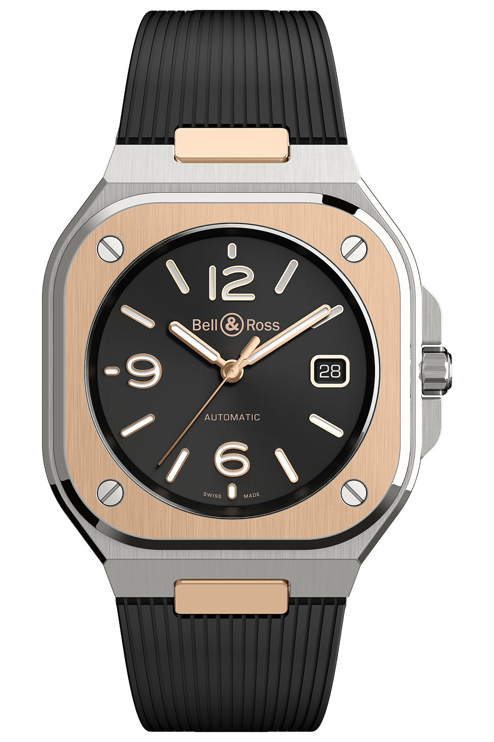 First in line for the 2020 collection is a luxurious and warm edition, which responds to the current trend for two-tone watches – and we all know that two-tone attires work pretty well in the context of sports watches with integrated bracelets. Without changing the original specifications of the BR 05, Bell & Ross adds a combination of steel and 18k pink gold to its ‘urban’ watch, with a newly designed upper module. The original bezel, which is still in stainless steel, has been carved and an 18k pink gold insert added on top. The 4 screws, a signature design element of the brand, are still in place and executed in steel for contrast.