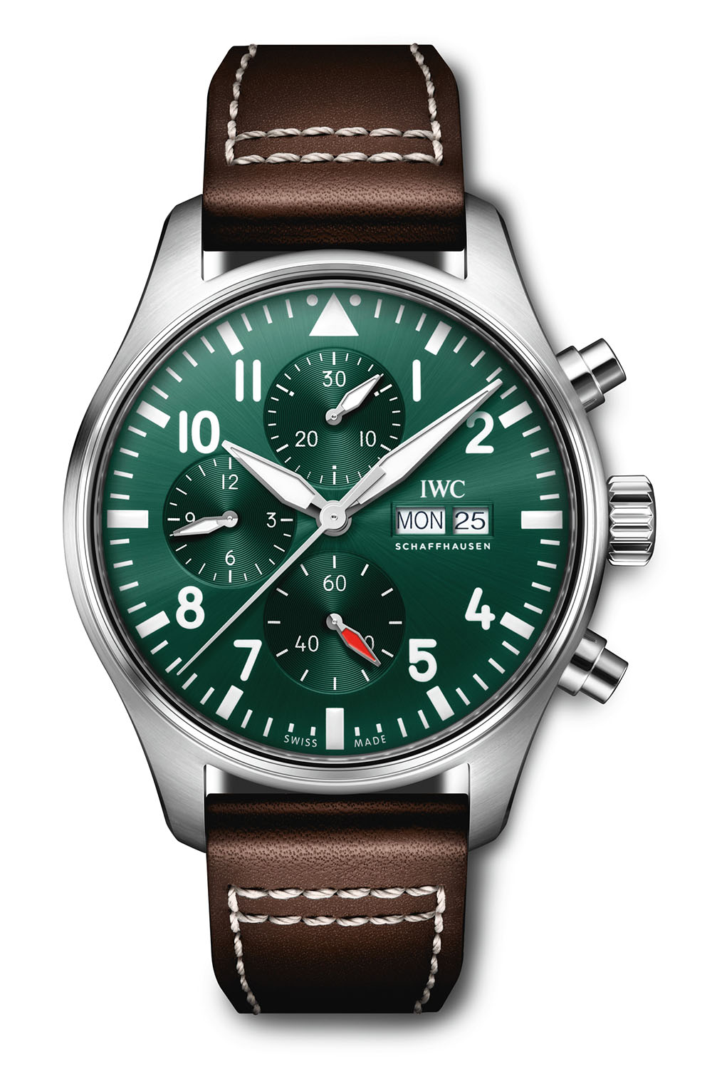 The new IWC Pilot’s Watch Chronograph 43 models are released with either a classic matte black dial (IW378001) or new sunray-brushed dials in dark blue (IW378003) or dark green (IW378005), all with white Super-LumiNova accents, white day-date discs and a red small seconds hand. Each comes with a 21mm calf leather strap closed by a pin buckle and can be effortlessly changed with IWC’s system.