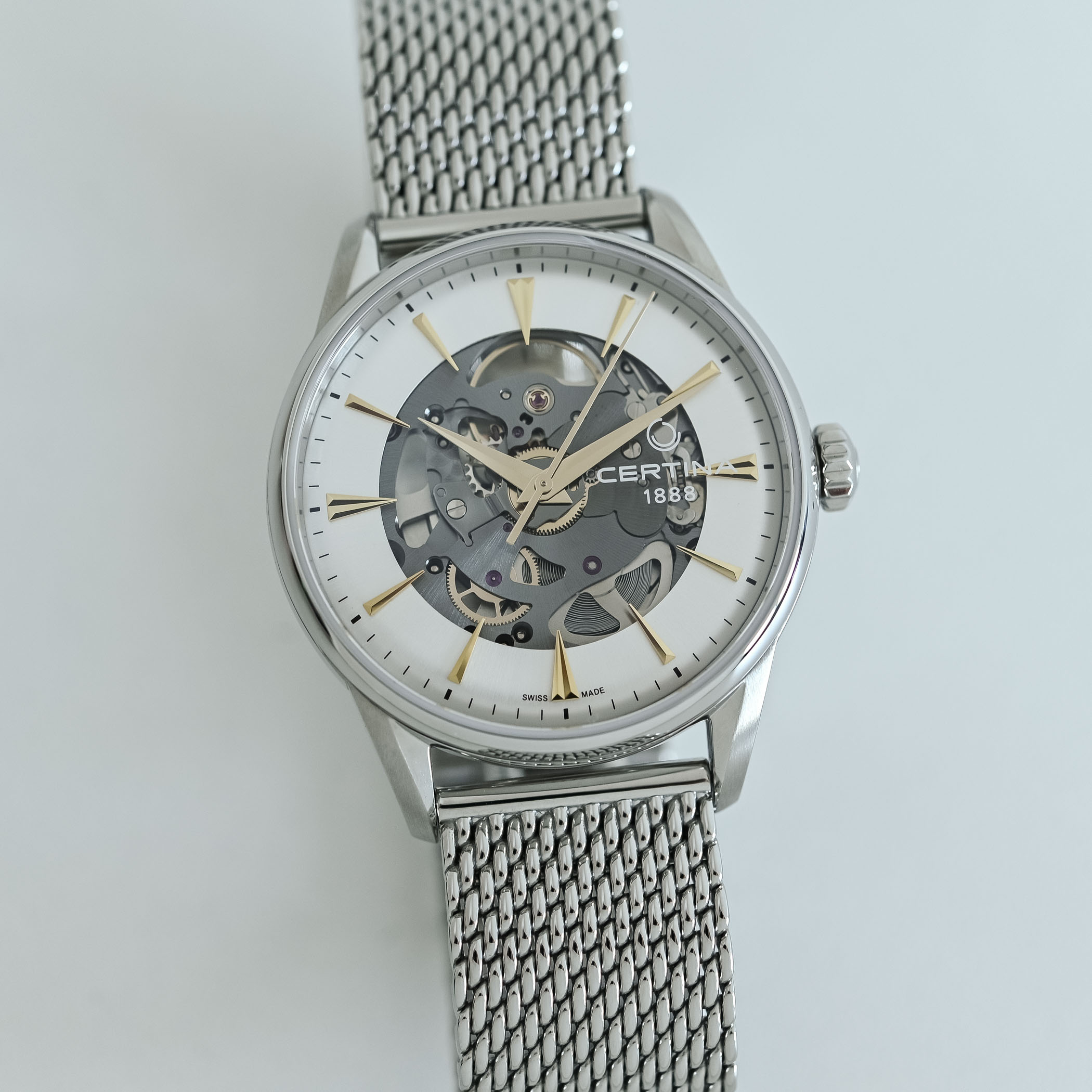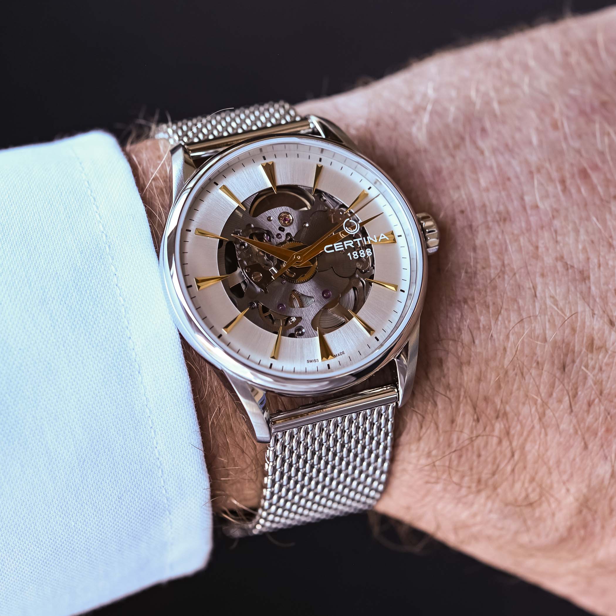 The openworked dial of the Certina DS-1 Skeleton has a large circular cut-out area in the centre, exposing the matte grey bridges supporting the components of the Powermatic 80. Used by other mid-price brands like Tissot, Mido and Hamilton, the Powermatic 80 is as robust as they come. An evolution of the ETA 2824-2, Swatch Group’s Powermatic is a resilient and precise industrial movement with a titanium-based alloy Nivachron balance spring that protects it from magnetism, shocks, ageing and temperature fluctuations. The modern Powermatic movement got its name from its powerful 80-hour supply of energy, a huge step up from the ETA 2824’s average of 38 hours.