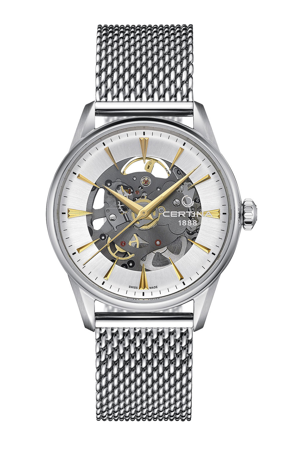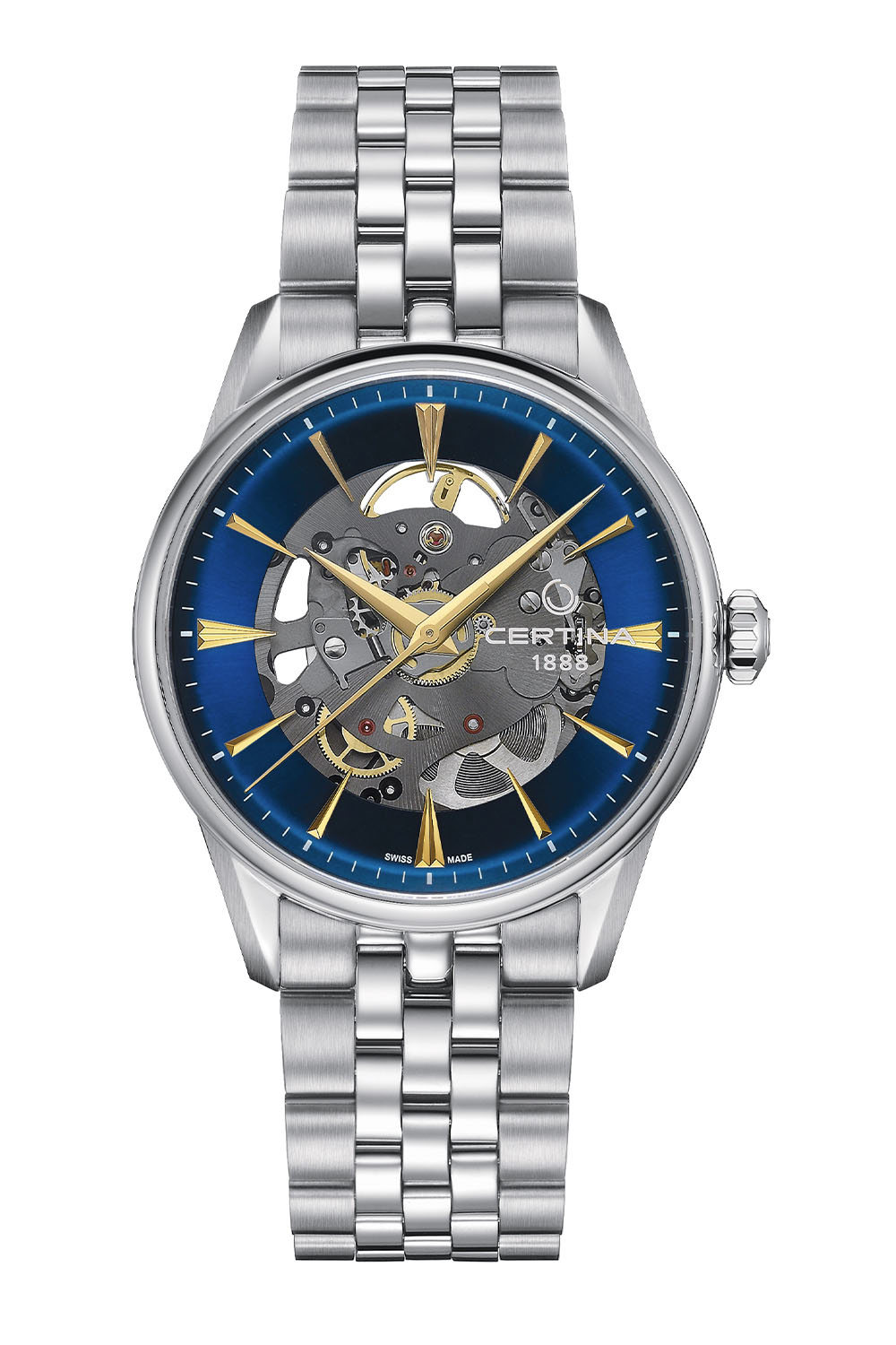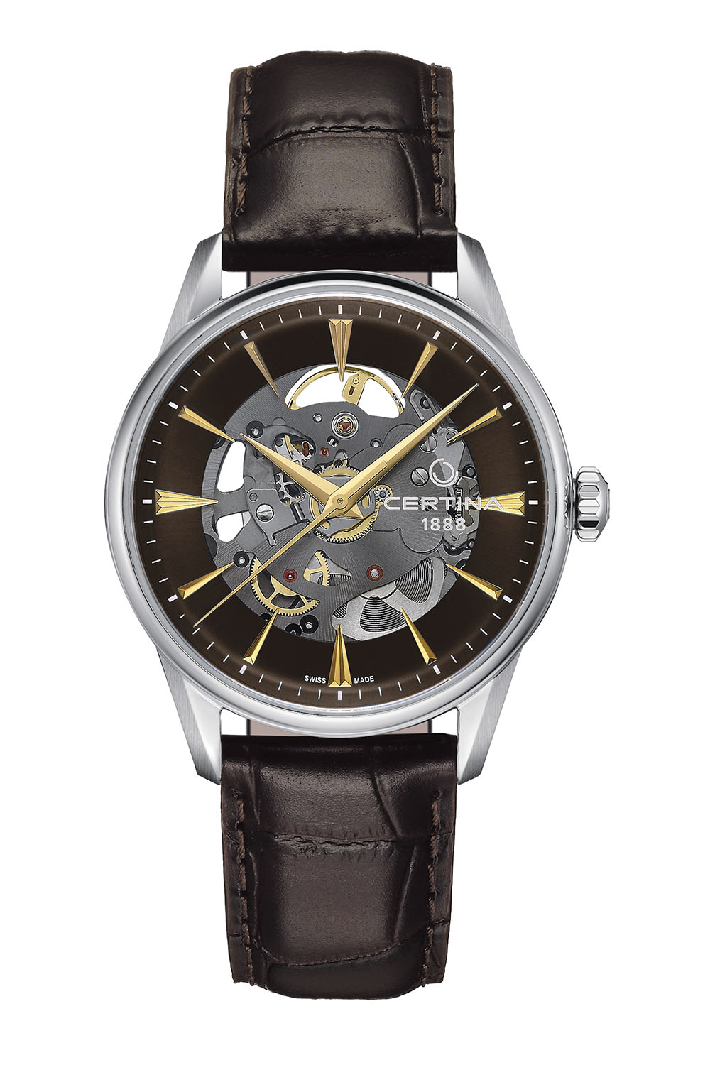 Revealing the main components of the movement, including parts of the barrel, the balance wheel and the gears, the dial provides an interesting lesson in watchmaking. A broad white, blue or brown chapter ring frames the openworked area and features the gold PVD hour markers. Far larger than the indices of regular DS-1 models, the arrow-shaped markers are faceted and evoke the style of Certina’s vintage timepieces; the markers at 12, 3, 6 and 9 o’clock are double for extra emphasis. The date window, a feature of all DS-1 models, has been removed. An anti-reflective sapphire crystal protects the dial, and the movement can also be seen through the transparent crystal on the caseback.