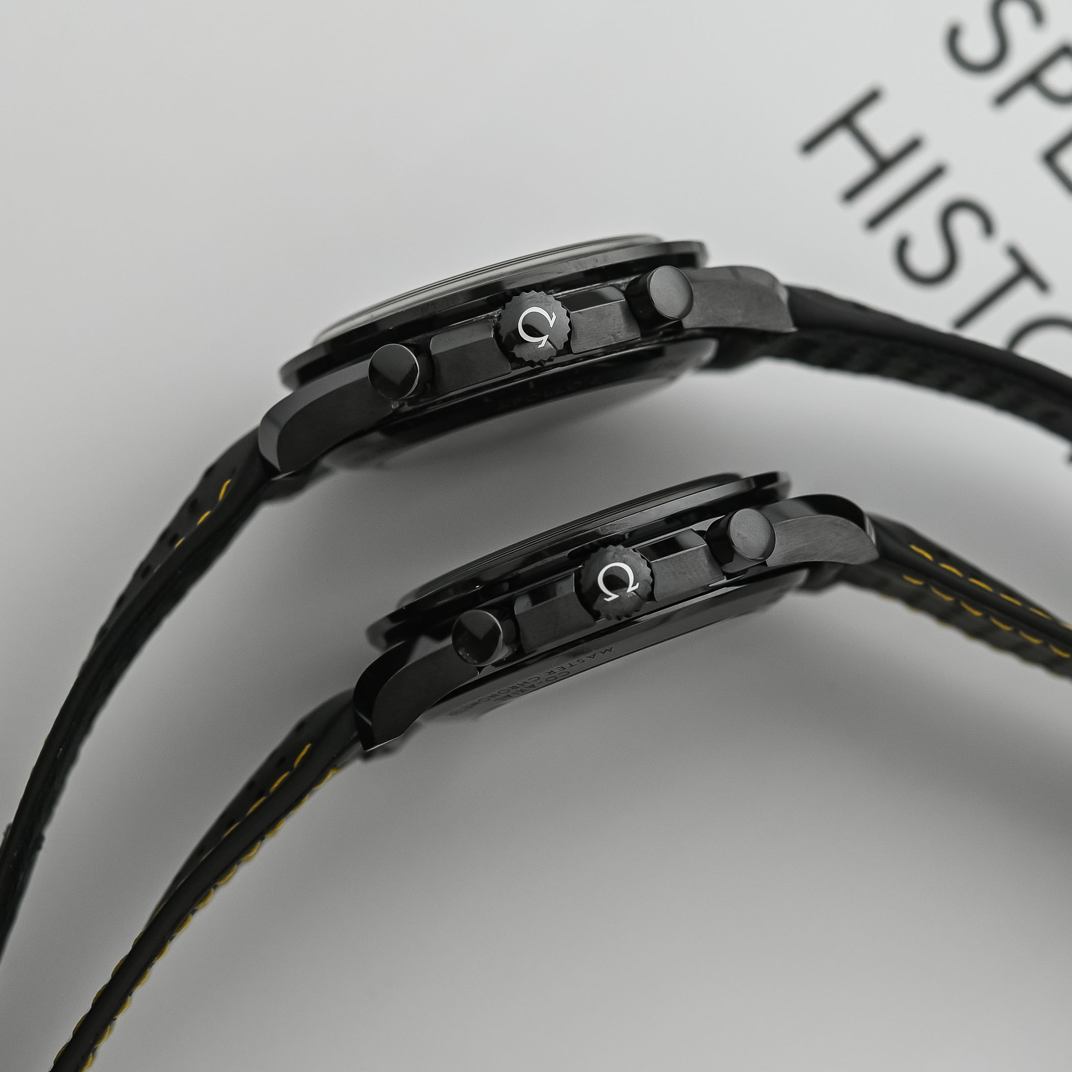 Let’s start with the case. As you might imagine, this new Speedy DSOTM retains the collection’s black ceramic construction and its large 44.25mm diameter. However, looking closely at the case, you’ll see that the shape has been revised. In the same vein as the new Moonwatch of 2021, the case has been remodelled to get closer to the look of the reference 105.012 – the first Speedmaster to feature an asymmetrical case and lyre-shaped lugs. Of course, we’re talking about minimal changes, but the profile is slightly different, specifically the tip of the lugs. Another difference is the thickness, which now sits at 13mm, while the previous generation was 13.80mm. The length of the case is measured at 50mm, which remains pretty compact considering the diameter of the watch.