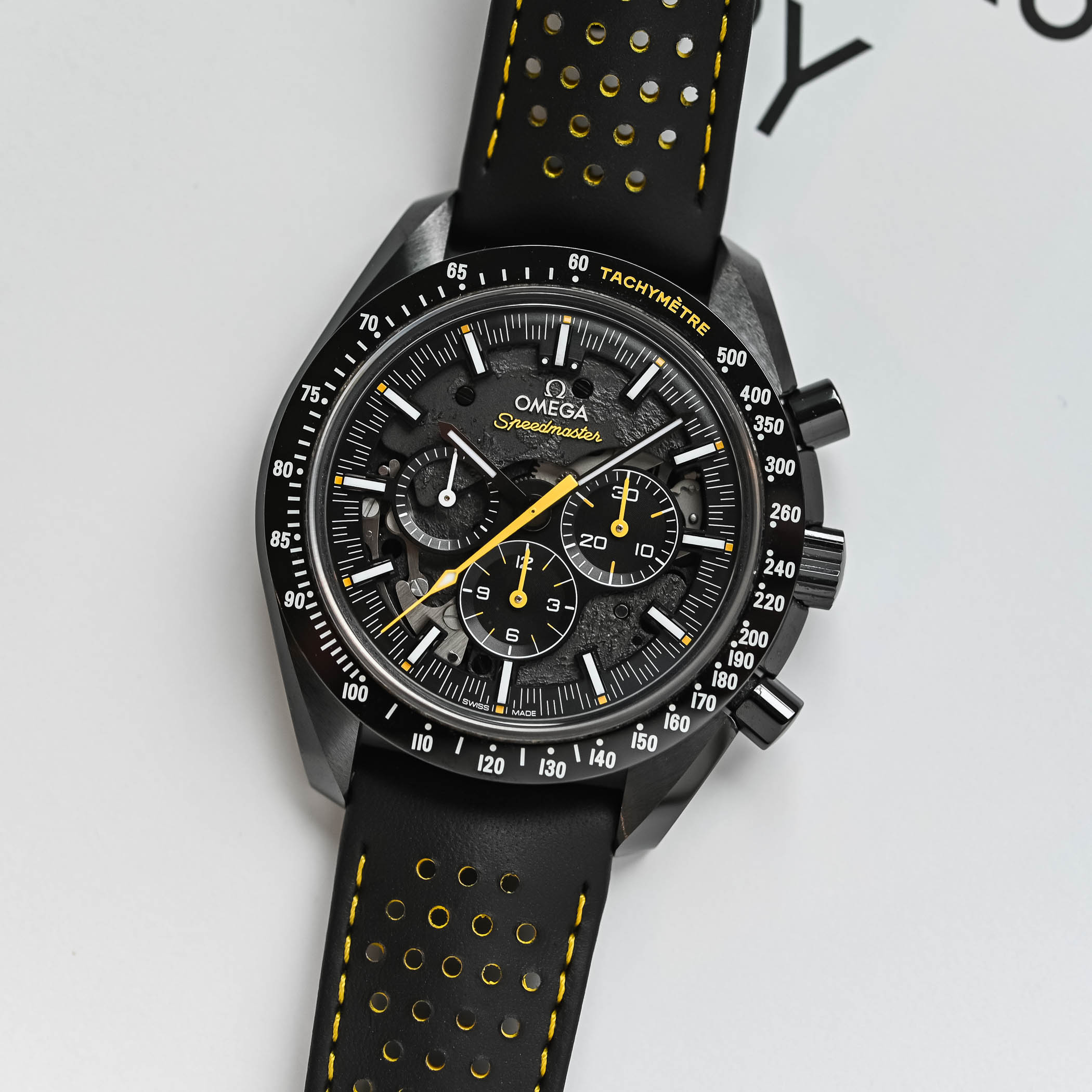 The last update to the Speedmaster Dark Side of the Moon Apollo 8 is the strap. Still measuring 21mm at the lugs and 18mm at the buckle, it is now entirely made of rubber, while the top layer was leather in the previous version. This black and yellow perforated strap is now closed by a folding clasp rather than an ardillon buckle, which is made of ceramized titanium with a ceramic closing mechanism.