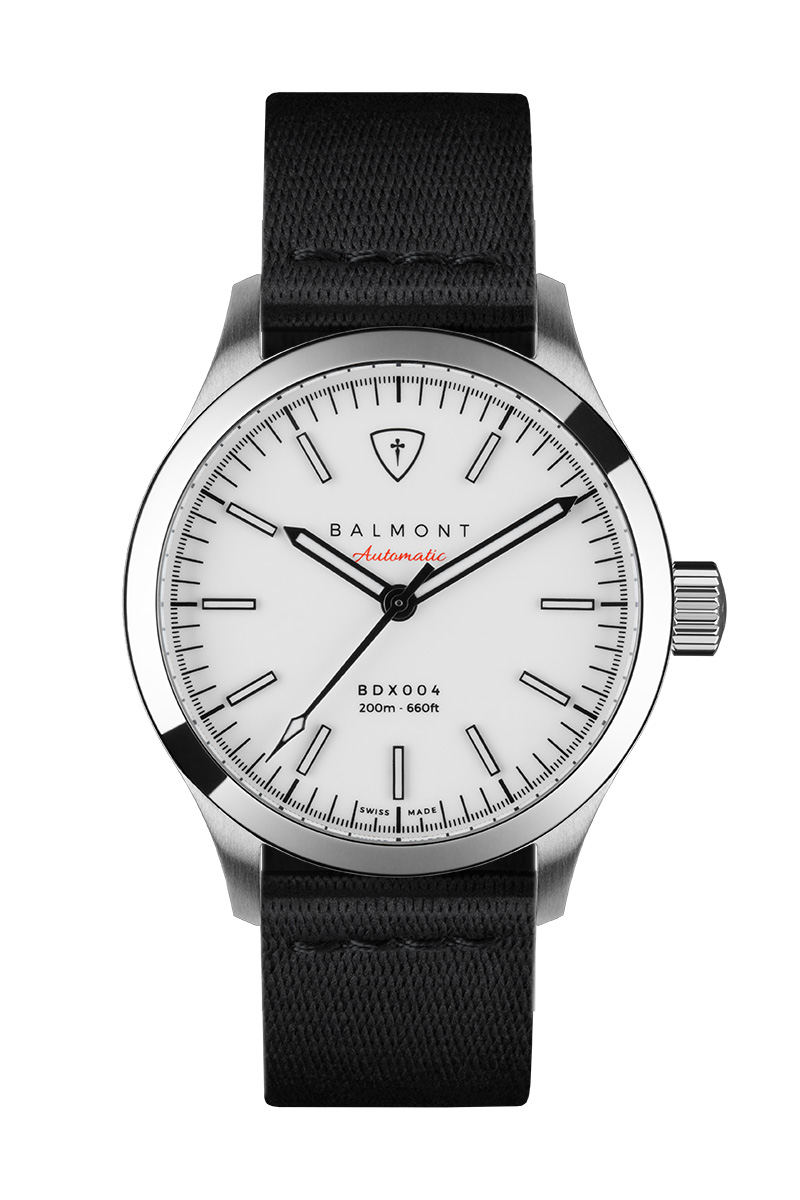 The Balmont BDX will be available in four different colours, once again classics of the industry. The solid white (BDX004) and black (BDX001) versions have a ceramic coating, while the silver (BDX003) and grey (BDX002) models are sunray brushed. Applied baton-shaped markers are riveted to the dial and filled with Super-LumiNova. The same is true for the hands. A precision seconds track sits at the periphery of the dial, and, wise choice, these are no-date watches.