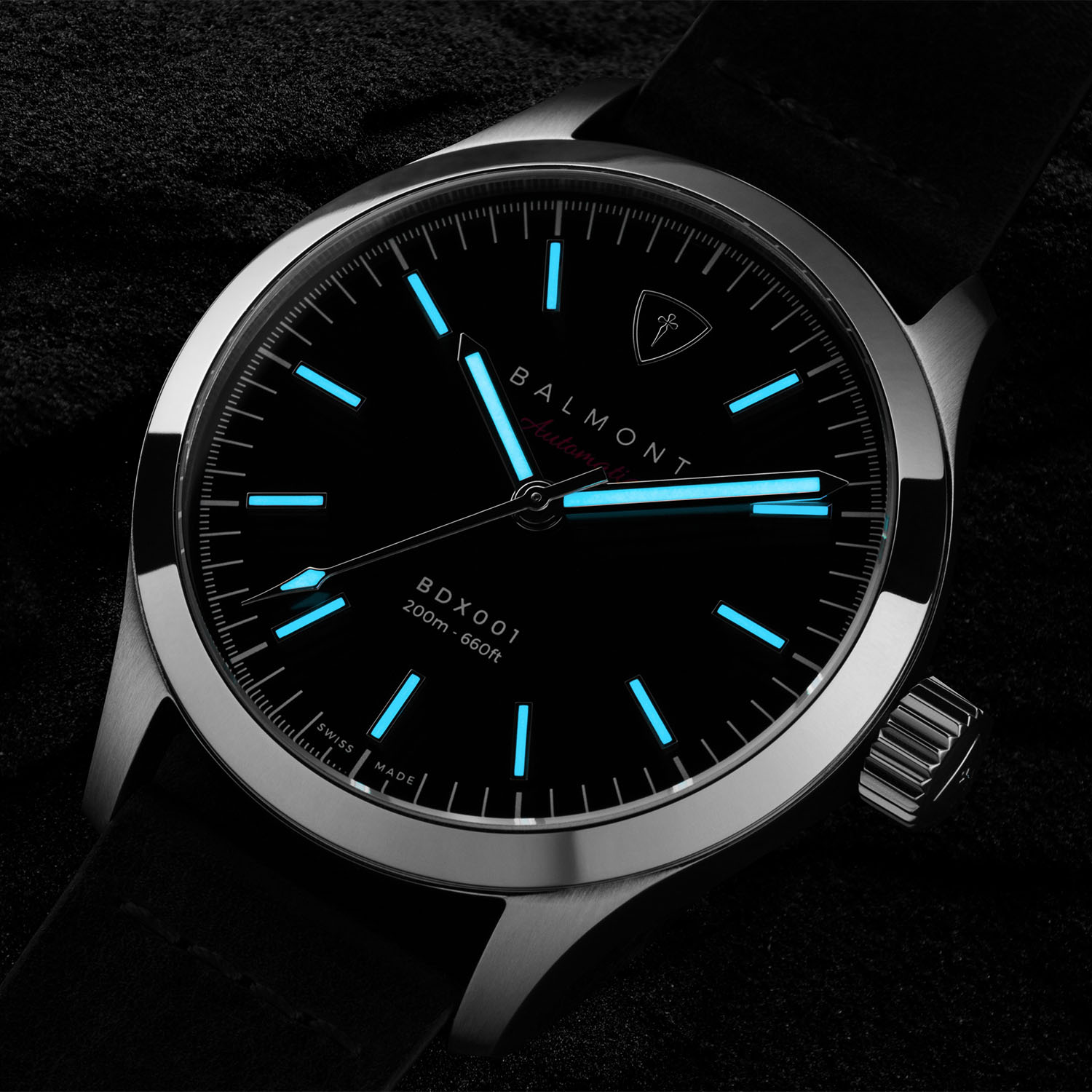 Let’s talk watches. The first collection launched by Balmont, named BDX, has been designed to be time-proof and adventure-proof. Classic, timeless designs on one side, solid specs on the other. A traditional recipe that has been used on multiple occasions but that has also proven efficient. The watch, whatever the dial, comes in a 40mm stainless steel case with a 12mm thickness and a 48mm length – nothing to complain about here. The dial is protected by a sapphire crystal with AR coating, the crown screws down, the caseback has a see-through crystal and is also screwed to the case, and the water resistance is a solid 200m. One nice small detail: the drilled lugs add to the instrumental look and make strap changes much easier.