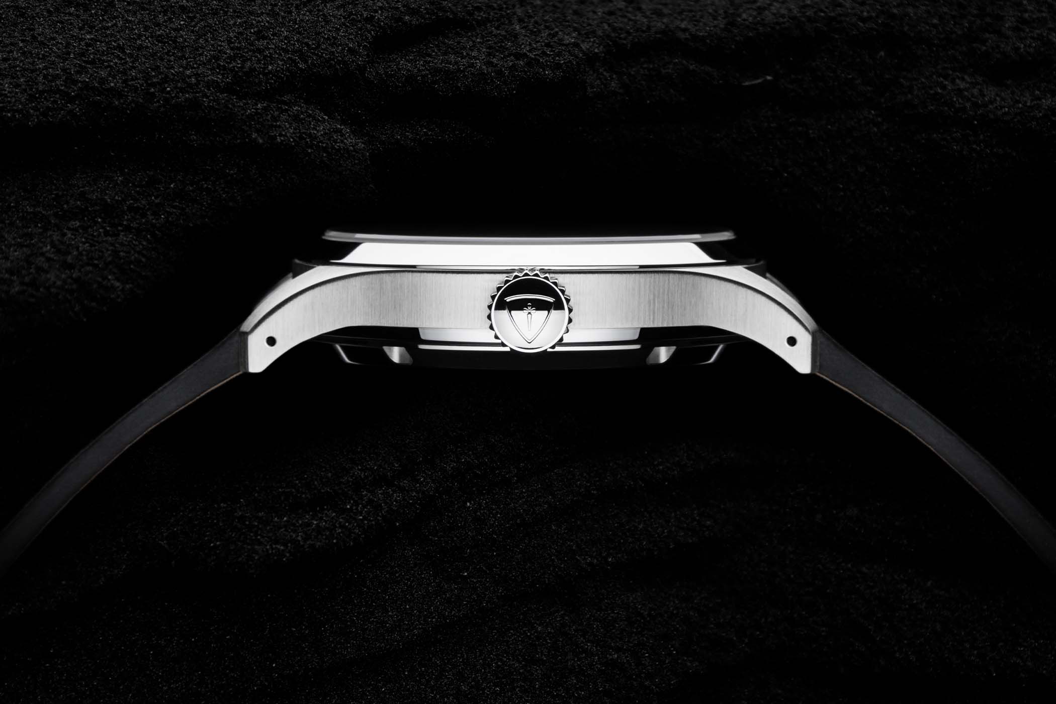 Inside the case is a Swiss-made Soprod P024, an alternative to the ETA 2824 and Sellita SW200. It runs at a 4Hz frequency and stores 38h of power reserve. It’s a reliable movement known to be easy to service. It’s offered here with a -7/+7 second/day accuracy. All watches come on a leather strap (colour depending on the dial) with an additional washable black fabric strap – a good option for adventure…