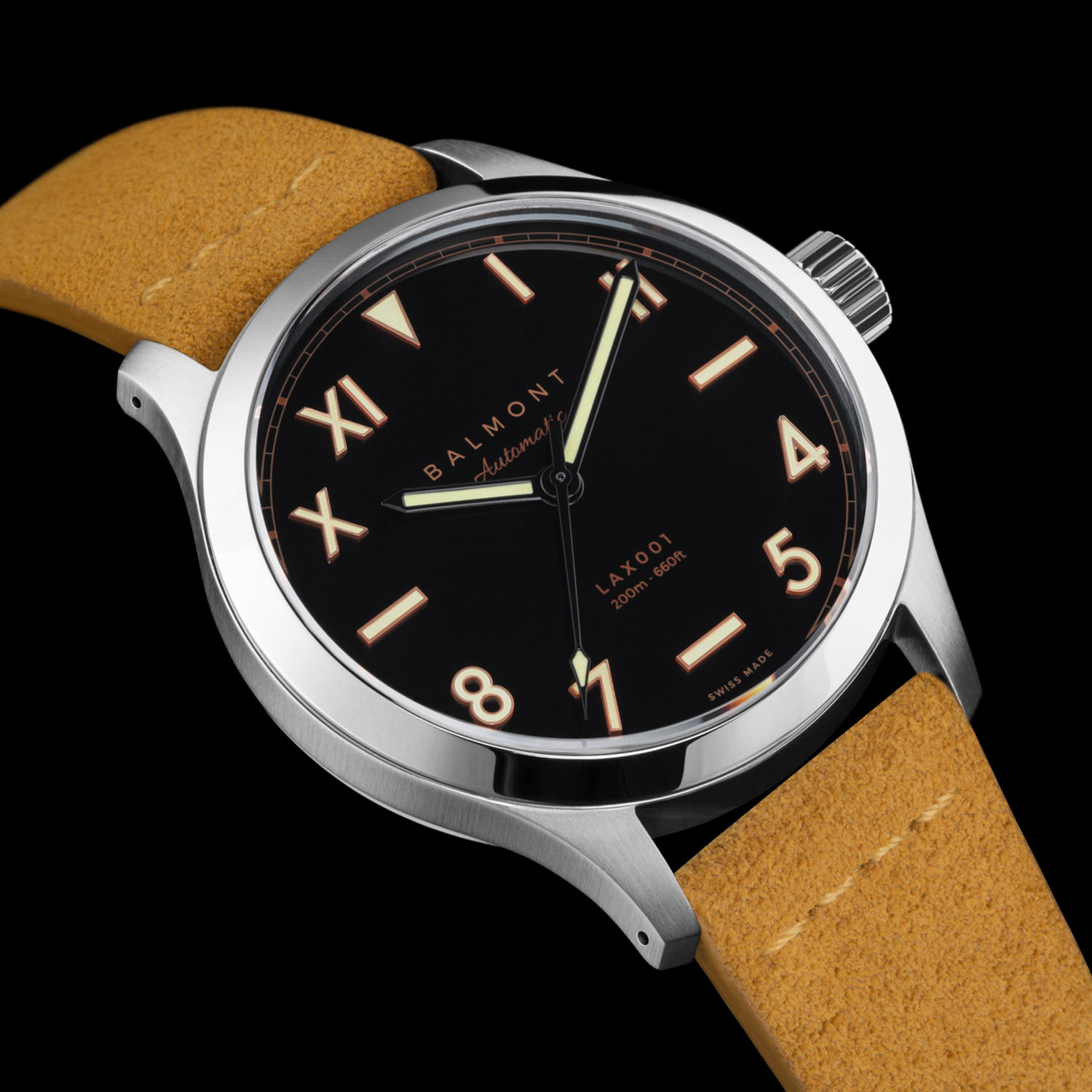 But there’s a fifth version, probably the most attractive model. Released as a limited edition of 100 pieces, the Balmont LAX001 features a black, ceramic-coated dial with riveted markers in a classic California style. All the elements are filled with cream-toned Super-LumiNova, and the dial has a gilt effect on its printings and railroad minute track.