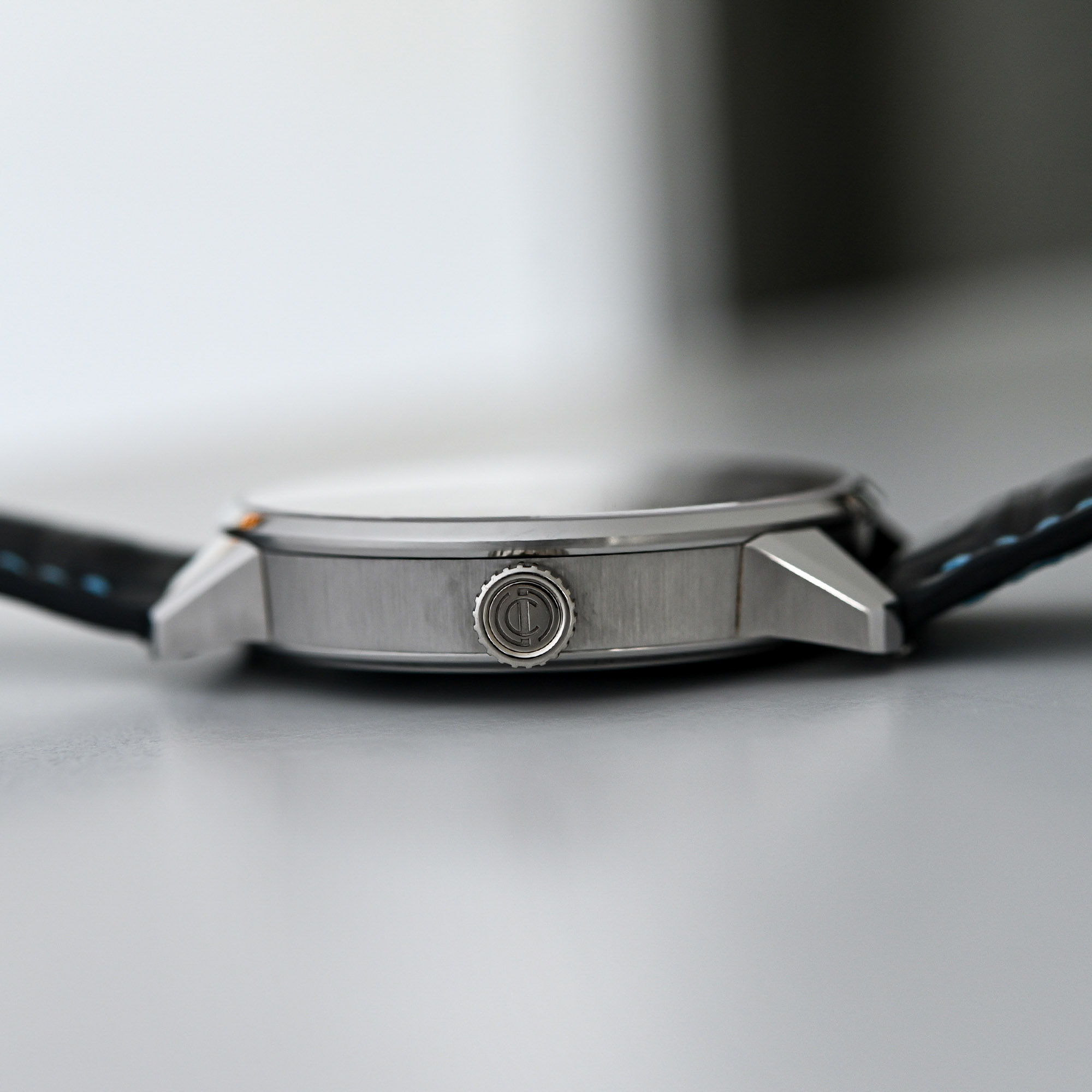 Contrasting with the anthracite PVD-coated main plate, the two dials stand out with sky-blue grenage and black azurage chapter rings – all this with the attention to detail and refined craftsmanship you’ve come to expect from Armin Strom. The symmetrical layout is enhanced by a cool, original three-dimensional ratchet mechanism positioned between the two barrels, ensuring even load distribution. Turning the watch over, the sapphire case back reveals the intricate architecture of the meticulously finished movement, showcasing hand-polished bevels, screws, and countersinks, along with circular graining, perlage, and Geneva stripes.