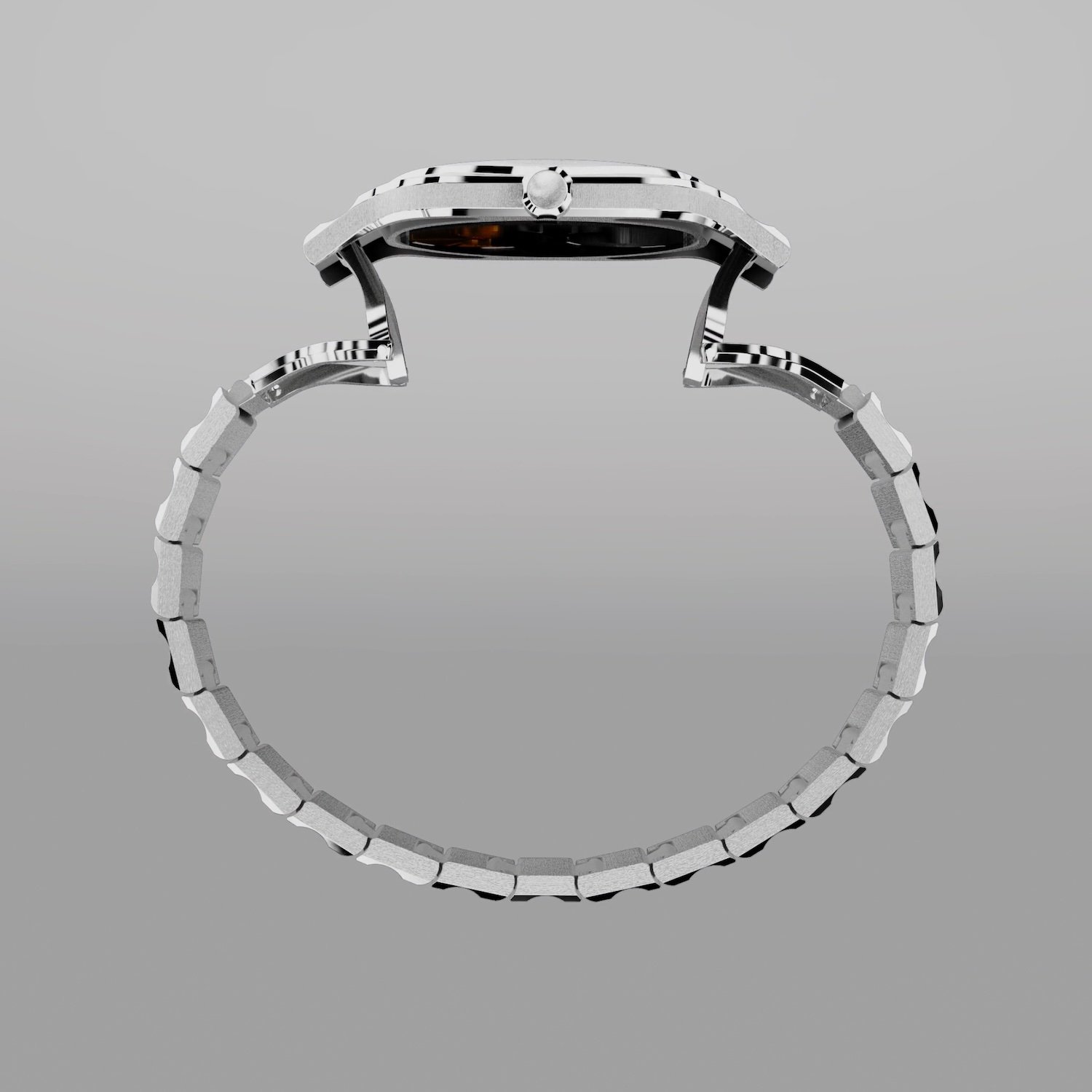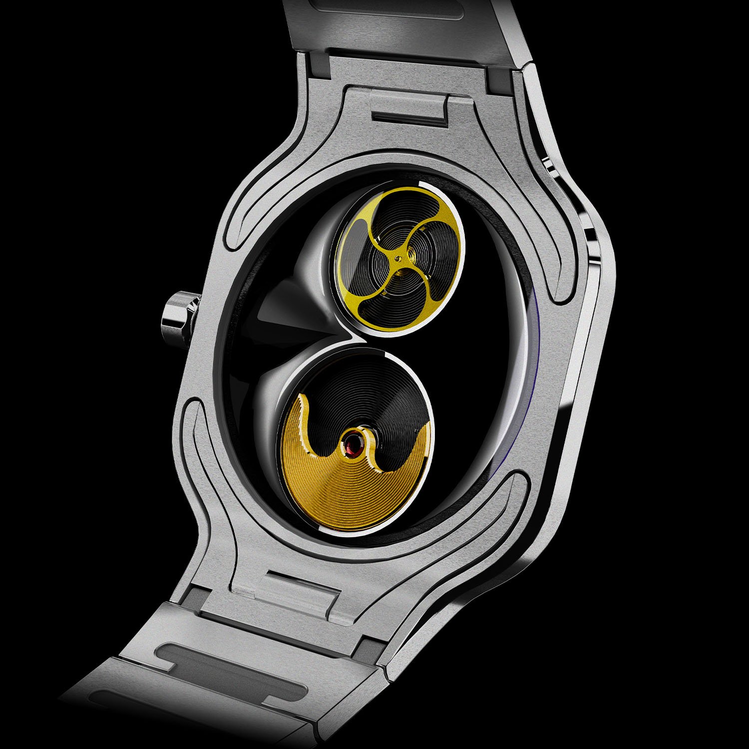The biggest surprise involves the integrated bracelet. Instead of a traditional clasp with “a protruding clasp system” at the end of a bracelet, the Force Majeure opens at the lugs. An ingenious design element, the openworked, wishbone-shaped deployant clasp is integrated on the underside of the case, creating a seamless, continuous flow of rectangular ingot-style links decorated with brushed and polished surfaces. Viewed from the reverse, the deployant wishbone clasp sits snuggly inside the case; each blade can be activated independently. The bracelet also features a novel, trademarked Snap-Link assembly, allowing the links to be detached without the need for tools.