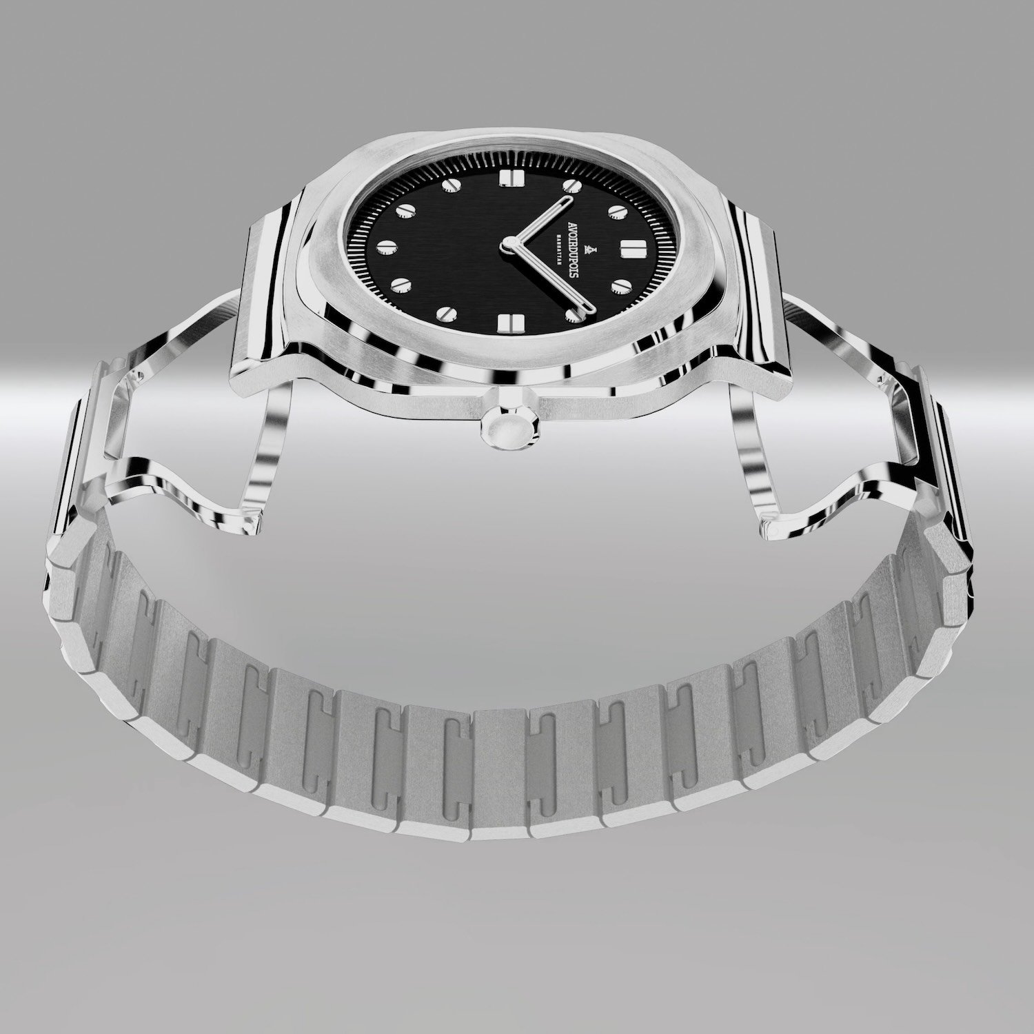 At first glance, the inaugural Force Majeure wristwatch is a fresh take on the integrated bracelet sports watch crafted in steel. The slim, rounded square monobloc case and round bezel, measuring 38mm (1.50″) across, 6mm (0.24″) thick and 48mm (1.90″) lug-to-lug, features a prominent brushed finish, lending it an industrial vibe. The reasoning behind the one-piece monobloc design is, as the brand relates, to reduce the “traditional five + ingress points” of normal watches to “only three points for water ingress.” That being said, the water-resistance is a classic 150 feet or 50 metres.