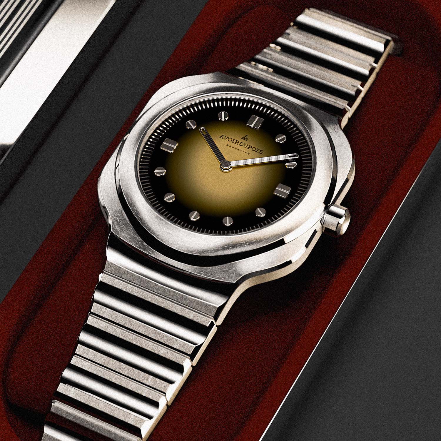 We have exciting news from the United States, and it has nothing to do with the Trump Administration’s Swiss watch import tariffs or their recent reduction. Avoirdupois, a New York City-based brand founded in 2017 by designer/engineer James Stumpf, has expanded its product mix beyond retro-styled furniture and lighting products to include watches. Designed and manufactured in the brand’s vertically integrated downtown manufactory, all the way down to the hairspring, the new Avoirdupois Force Majeure surprises on all fronts. Characterised by a pragmatic monobloc steel case construction, an ingenious deployant clasp on the integrated bracelet, industrial design vibes, and a micro-rotor calibre, the 100% Made-in-Manhattan Force Majeure marks a new chapter in mechanical design for Avoirdupois.