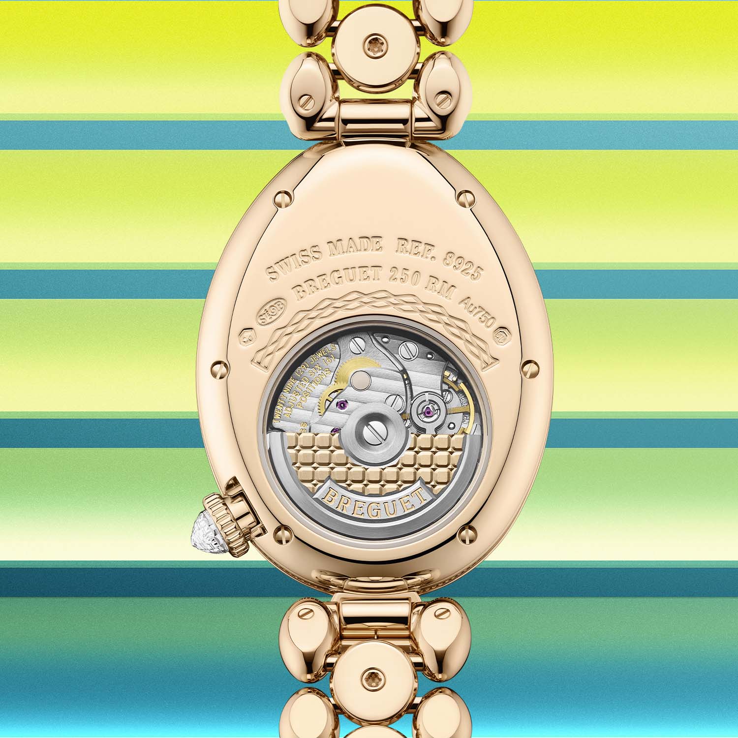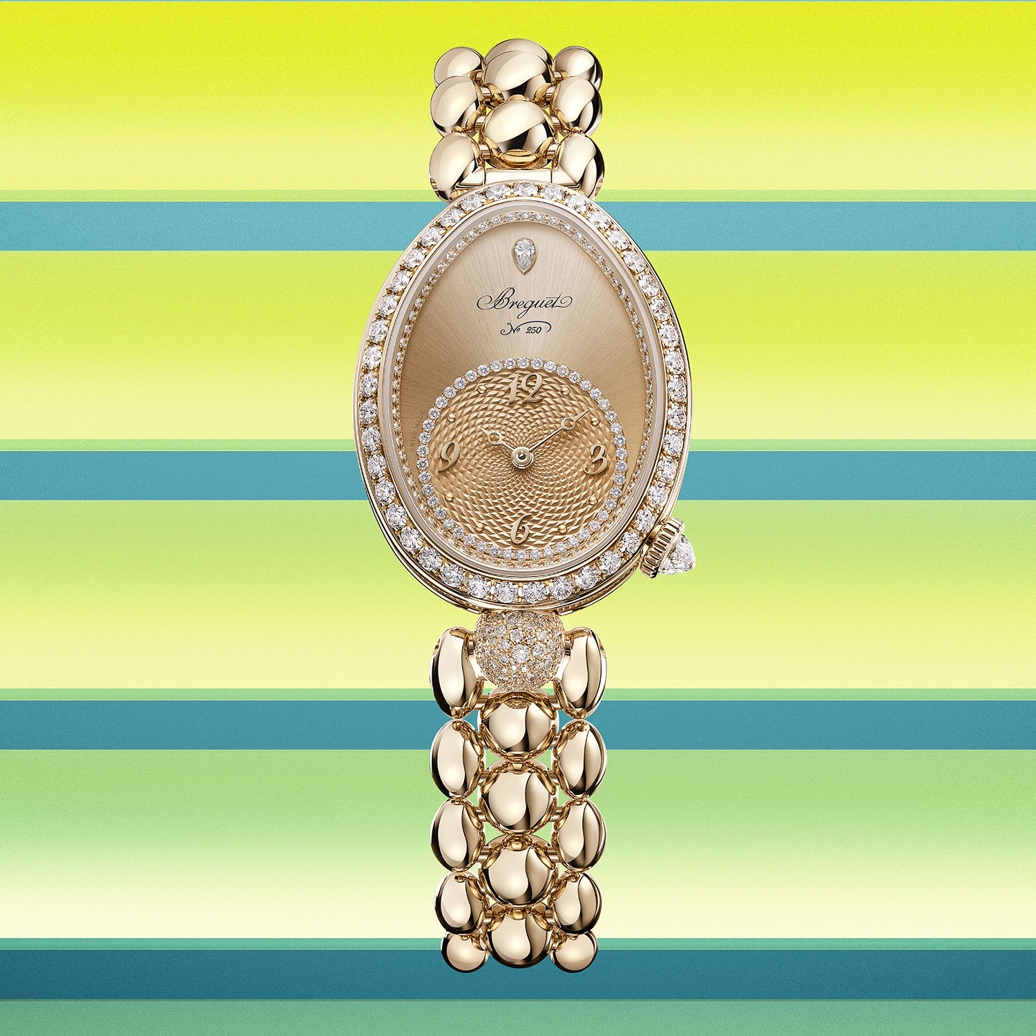 Quick facts: 25mm x 33mm x 8.5mm – 18k Breguet gold – 107 brilliant-cut diamonds set in bezel and flange, crown at 4 o’clock with briolette-cut diamond – round central lug snow-set with 52 diamonds – 30m water-resistance – Breguet gold, white mother-of-pearl or black lacquered with black aventurine – pear-cut diamond at noon – calibre 586/1 – automatic – 180 components, 29 jewels – gilded platinum rotor with Petit Trianon guilloché – 21,600vph / 3Hz – flat silicon balance spring – 38h power reserve